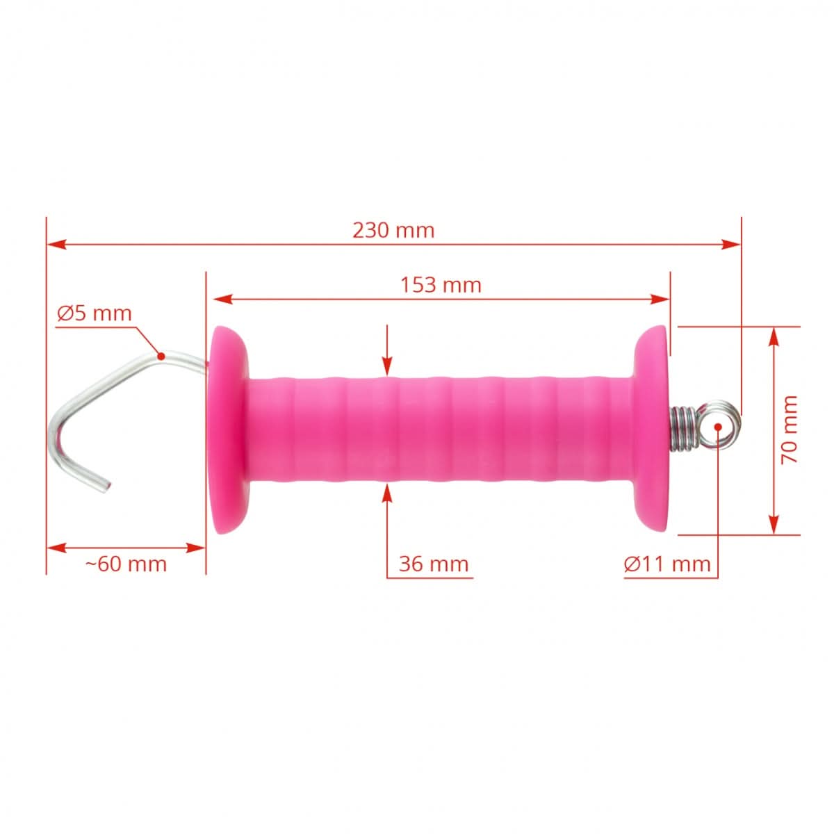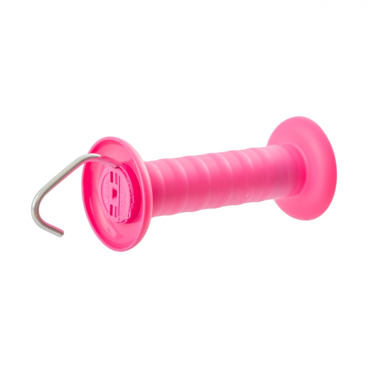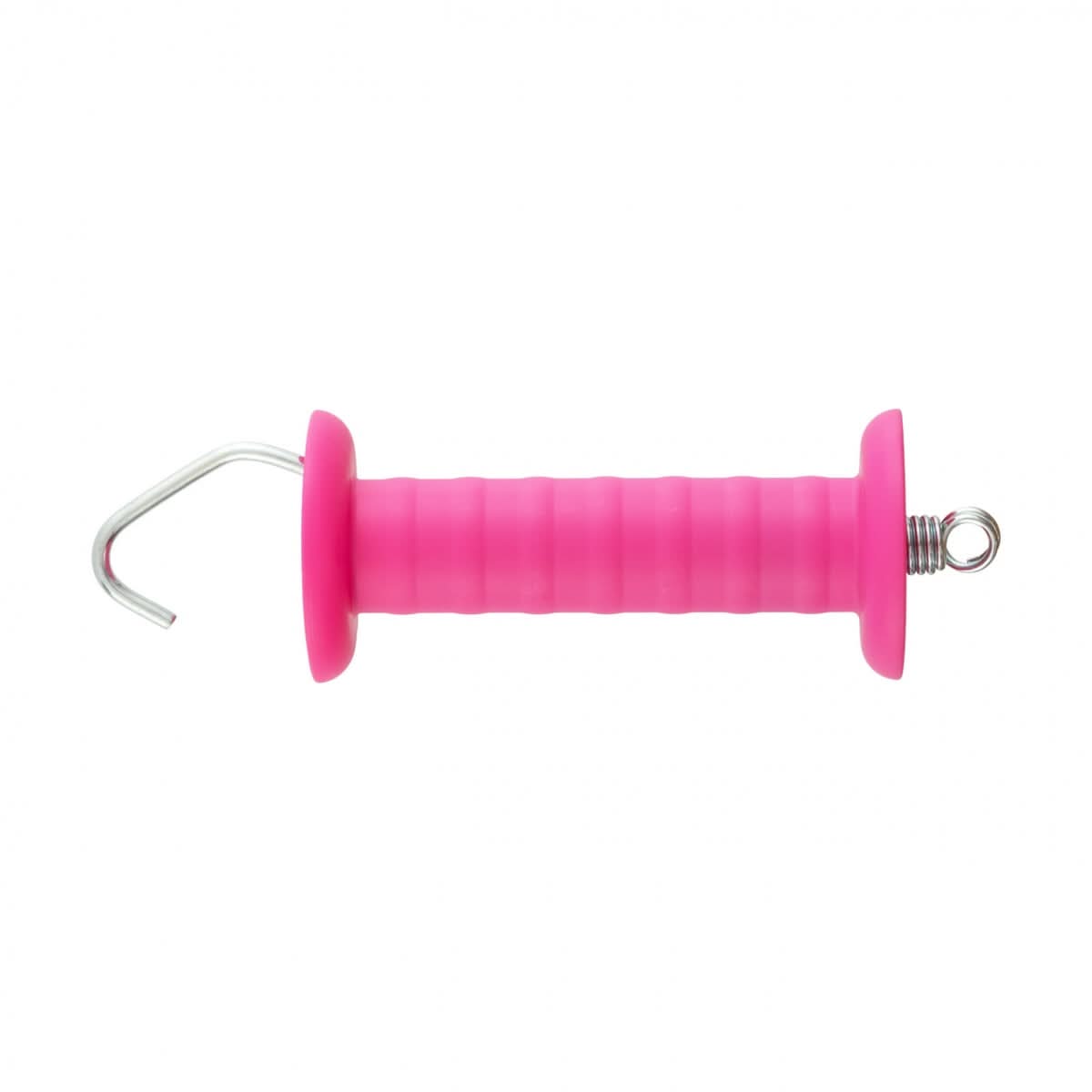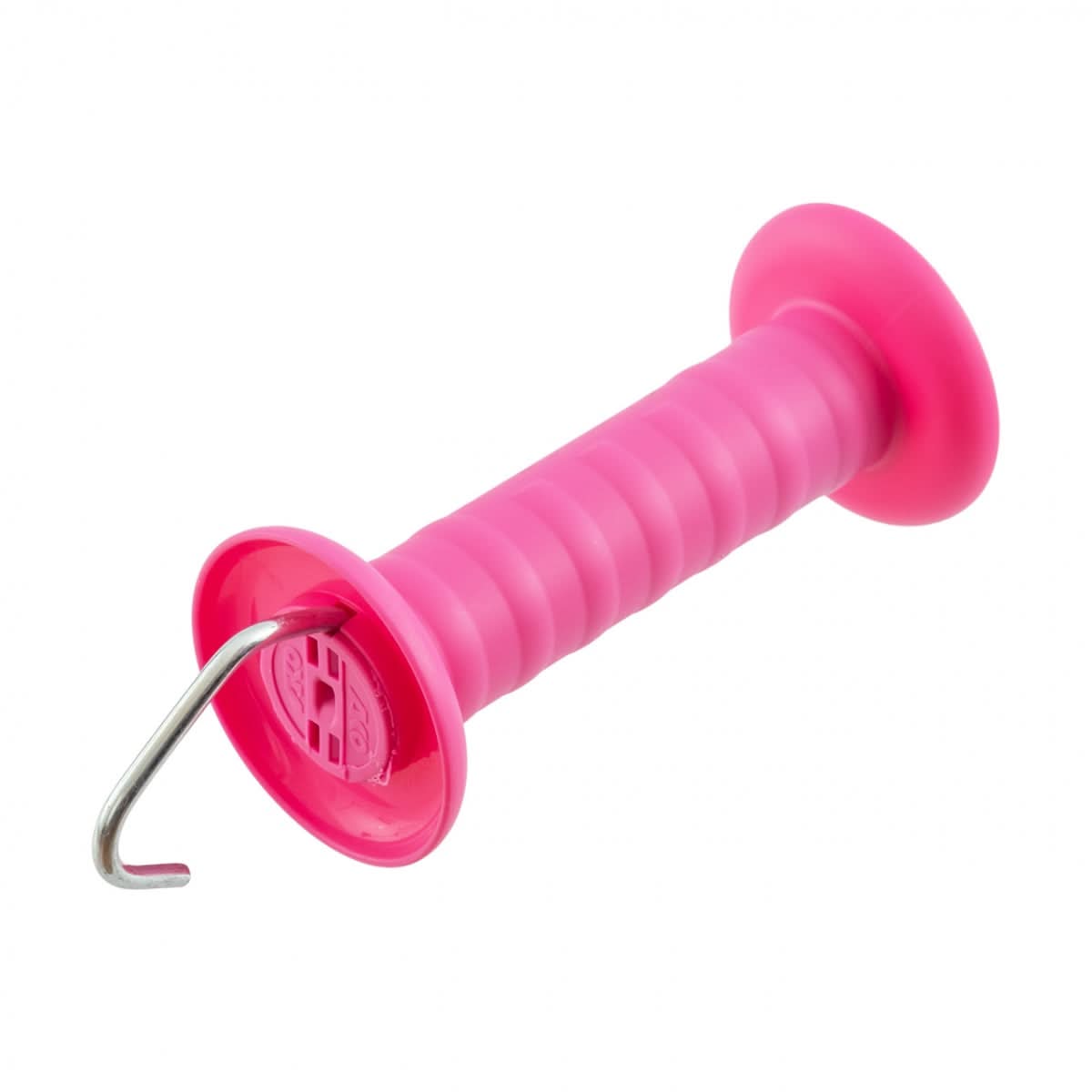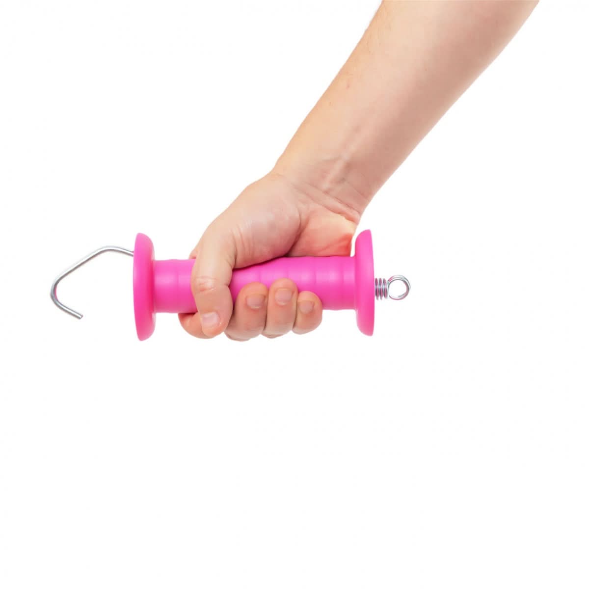 Maner roz pentru poarta gard electric, cu carlig si arc. Manerul este potrivit atat pentru fir cat si pentru banda.
