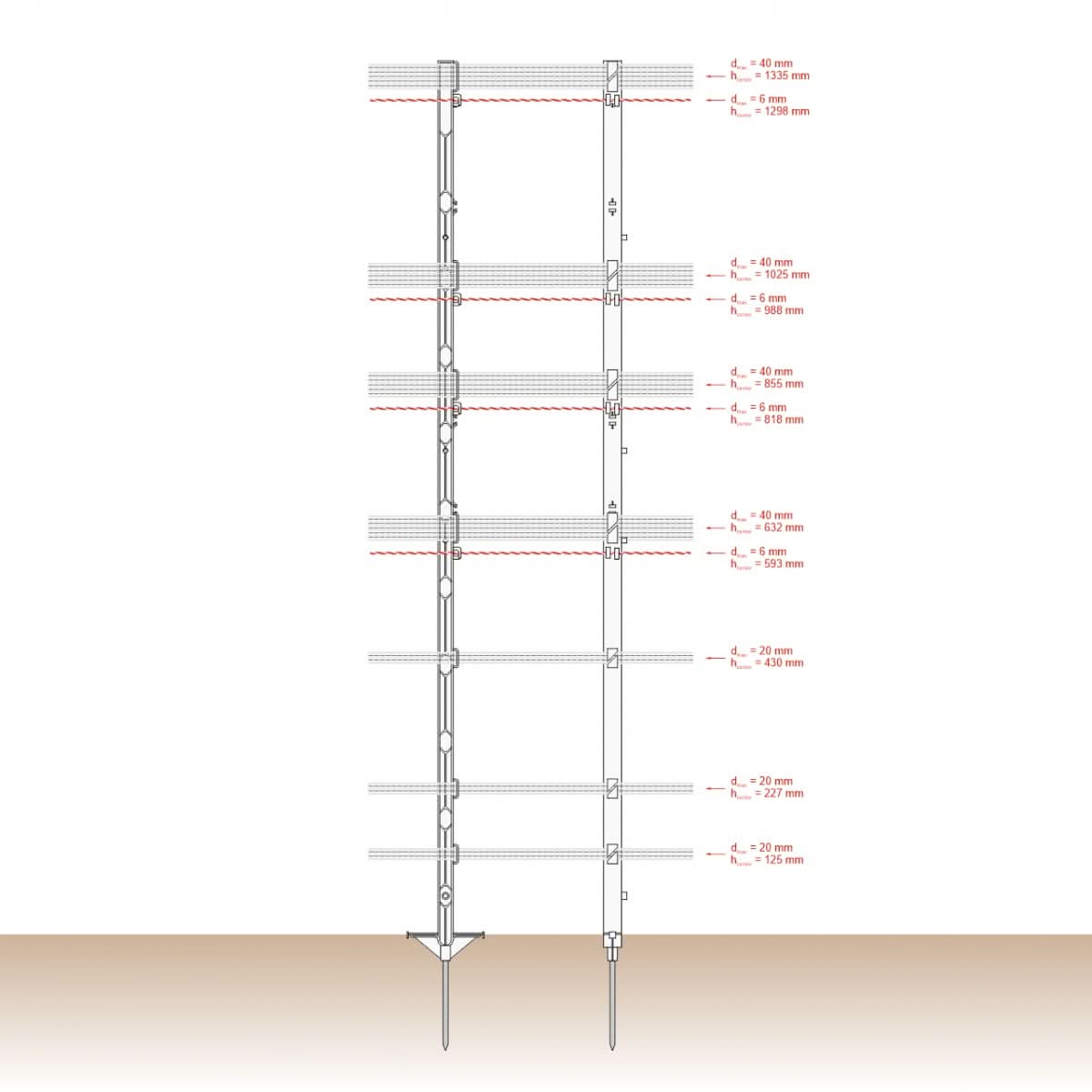 La baza, stâlpul este prevăzut cu un vârf din oțel galvanizat, ceea ce facilitează înfigerea acestuia în pământ. Se recomandă amplasarea stâlpilor la fiecare 5 metri și utilizarea unor stâlpi mai puternici la colțuri, porți și capete pentru o stabilitate mai mare.