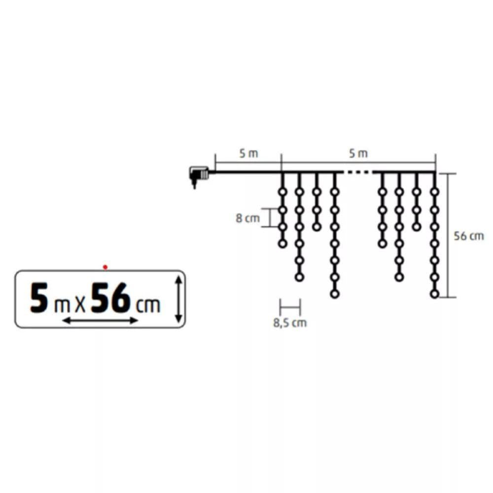 Perdeaua luminoasa LED KKF600D10M ofera un efect spectaculos tip sloi de gheata, combinand lumina alb cald cu accente intermitente alb rece pentru un impact vizual deosebit. Cele 600 LED-uri DOT sunt aranjate astfel incat fiecare al doilea sir include un LED sclipitor alb rece, creand dinamism si eleganta. Cablu transparent pentru integrare discreta si alimentare prin adaptor IP44 permite utilizarea sigura atat la interior, cat si la exterior, indiferent de conditii.