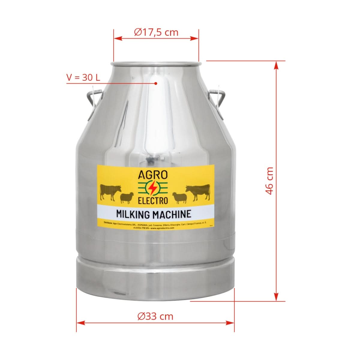 - Bidonul din inox de 30 litri este ideal pentru utilizarea cu aparatele de muls, fiind rezistent și ușor de manevrat. Acesta este prevăzut cu: