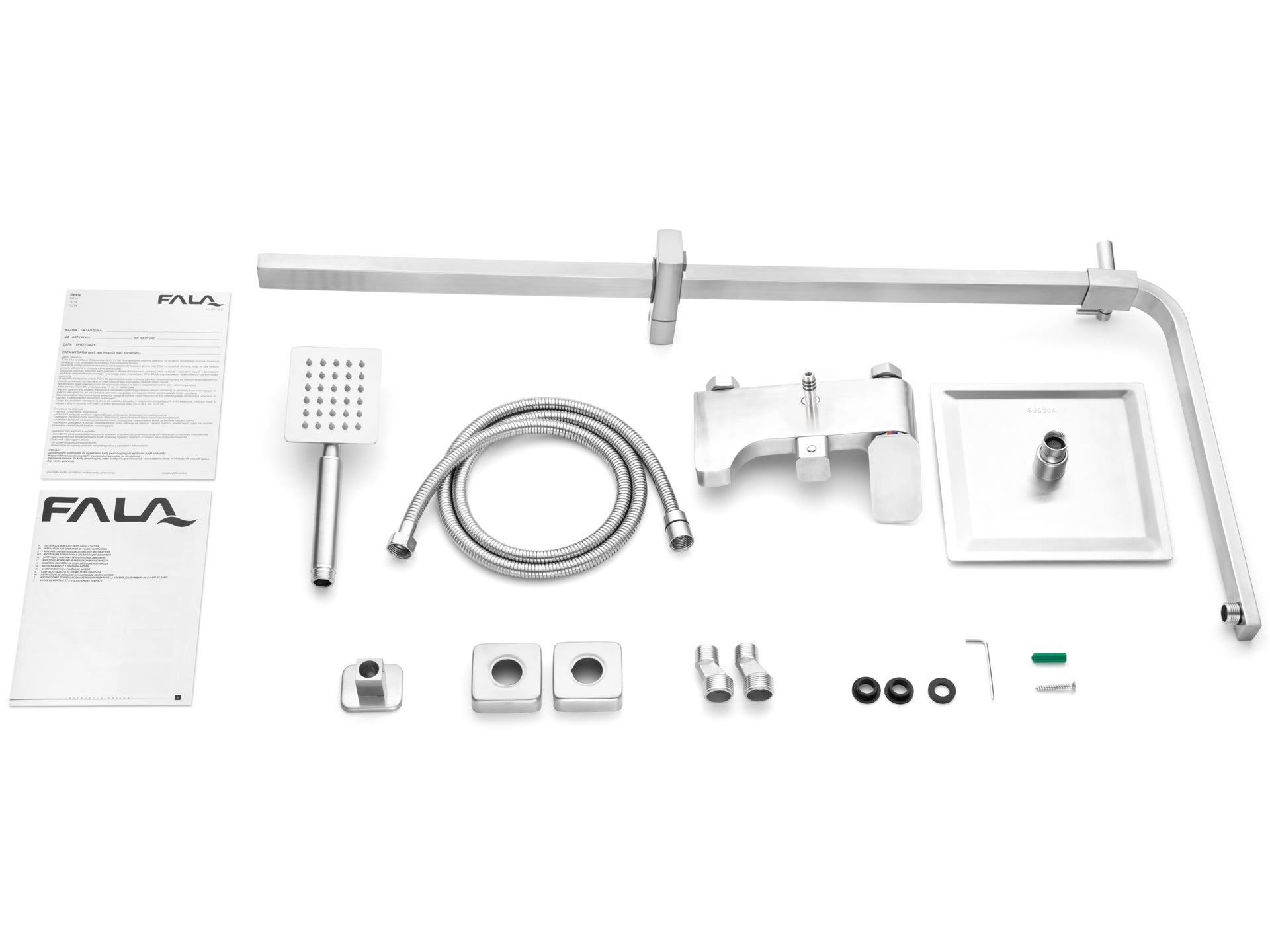- Setați conținutul: accumulator|cap de duș|furtun de dus cu garnituri|duș cu ploaie|tija de dus|came cu rozete și sigilii
