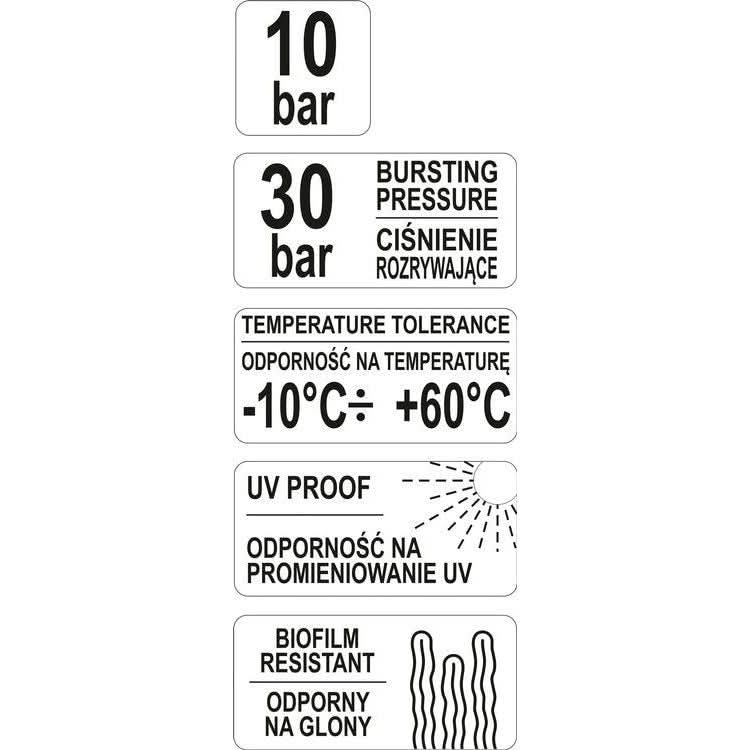 Furtunuri de grădină Strong Line cu structură durabilă și armată. • rezistență crescută la delaminare, rupere și răsucire, menținând în același timp o flexibilitate ridicată. presiune de rupere: 30 atm • interval de temperatură: -10 ° C până la + 60 ° C • rezistent la UV;