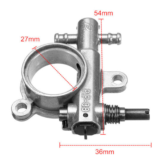Pompa ulei drujba compatibila pentru modelele de drujbe chinezesti model 3800: NAC SPS01-38, Faworyt TS41, Topsun 4116, Einhell T4116, Ruris 220 Pentru dimensiuni va rugam sa consultati imaginea de mai jos: Melcul pentru aceasta pompa: aici . Mentionam faptul ca produsul nu este original, insa este compatibil pentru modelele enumerate mai sus .
