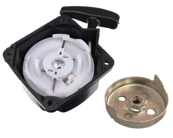 Demaror pornire motocoasa complet Demaror intalnit pe motocoase cu motoare chinezesti tip (BC CG CYG) 32, 33, 43, 415, 430, 520 printre care: Ruris Musson 420D si Musson 340D DEMON, NAC, VICTUS, POWERTEC, TEXAS. Alpina BJ345 / TB34D, Alko BC410 / BC4125 / BC4535, Agroma BJ345D, Castorama SPS02-43BC, Garland BT430, Harder PNBC 260 - 1T / PNBC 415 - 2T, Makita BCM3200 / BCM4300. Pentru a fi sigur ca acest demaror se potriveste cu al dvs. va rugam sa confruntati dimensiunile cu cele din pozele noastre. *Se livreaza cu tot cu oala din imagine