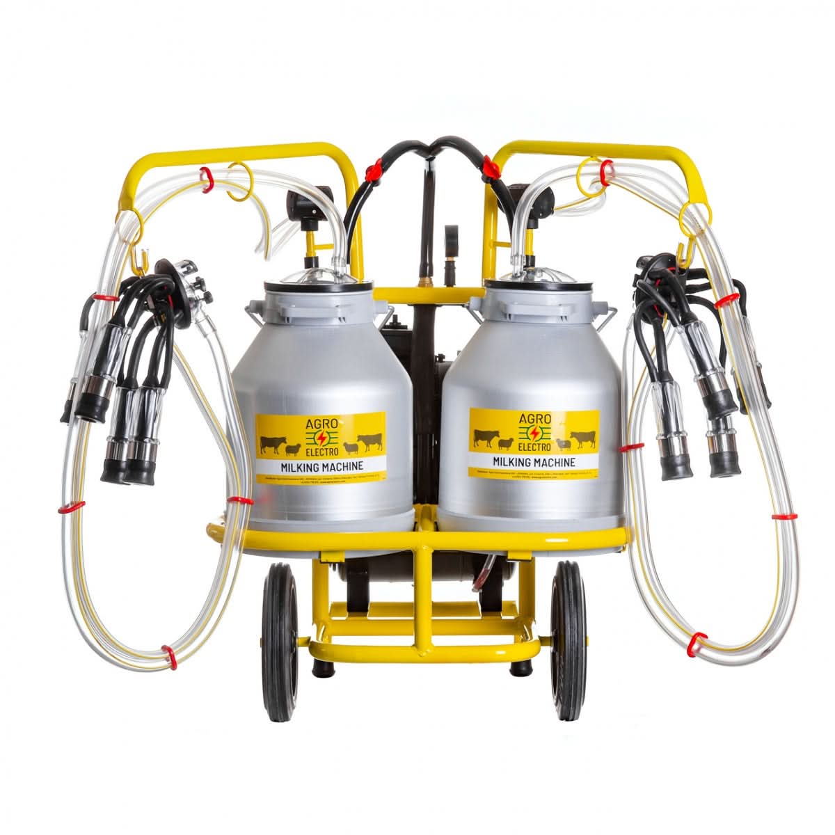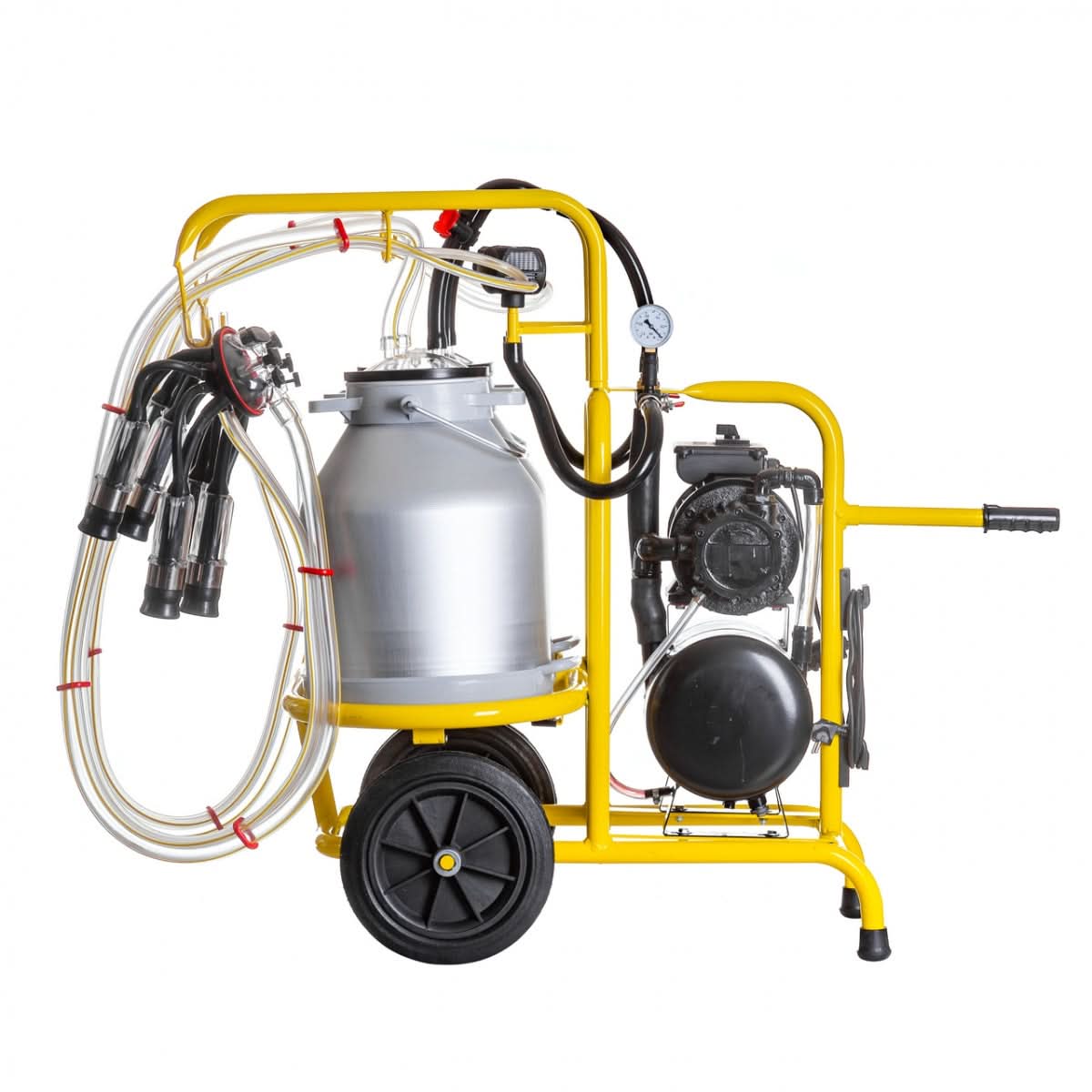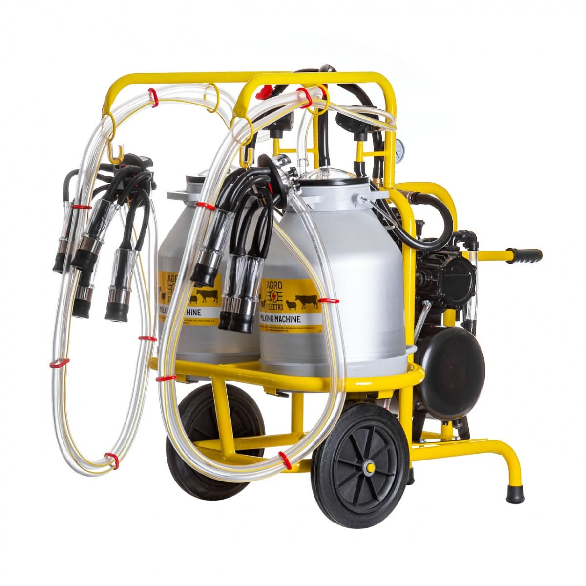 Aparat de muls vaci cu două posturi și două bidoane din aluminiu de 30 litri, ideal pentru fermierii care doresc să mulgă rapid și eficient vacile, fie pe câmp, fie în grajd. Acest aparat portabil este echipat cu două pulsatoare și o pompă de vid cu ulei, oferind o performanță optimă pentru mulsul animalelor de lapte. Datorită dimensiunilor sale compacte, este ușor de transportat și depozitat.