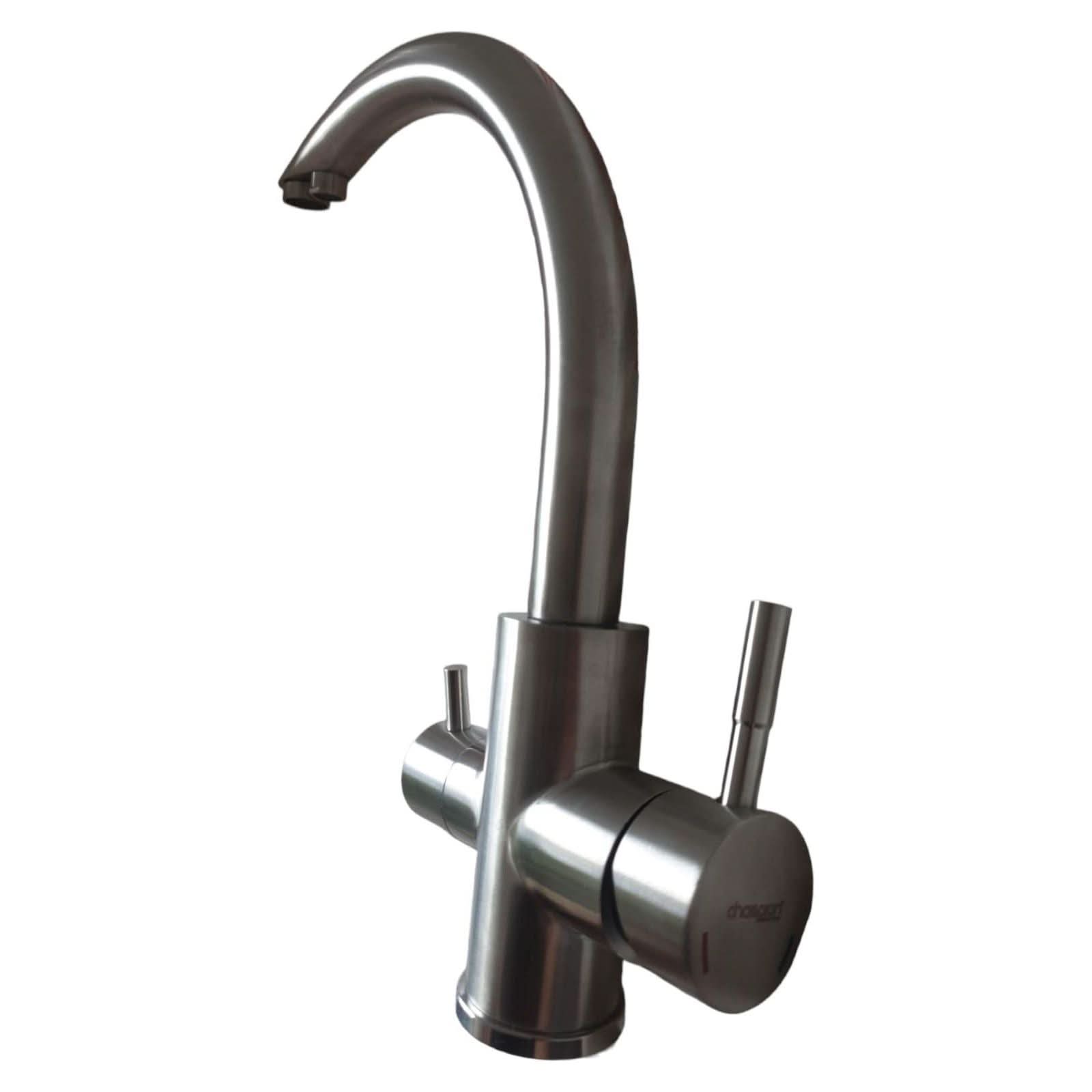 Baterie pentru bucătărie Champion SUS-021, fabricată din oțel inoxidabil rezistent și durabil. Dispune de robinet filtru pentru apă curată și cartuș ceramic pentru un control precis al apei. Tipul de comandă dublă asigură un ajustaj rapid al temperaturii și debitului apei. Racordurile sunt incluse în pachet, pentru o instalare ușoară și rapidă.