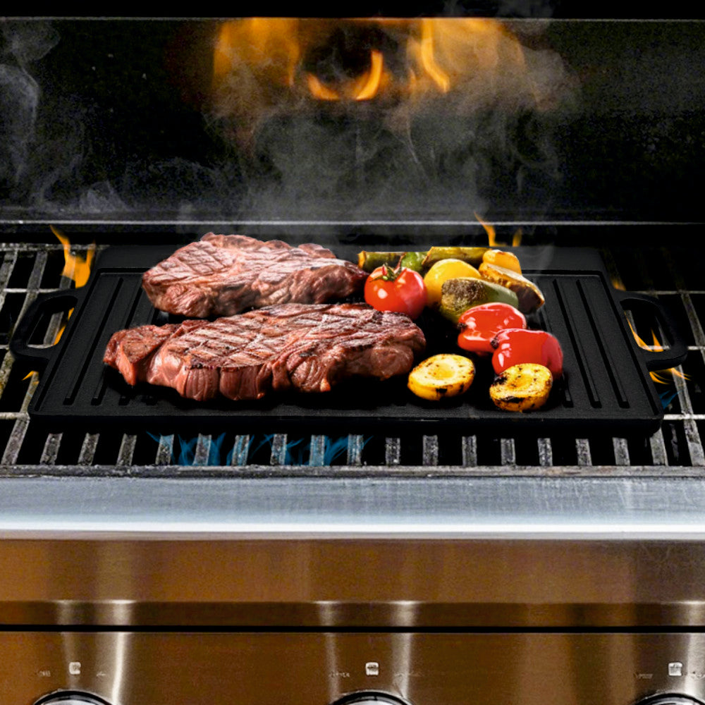 Bucura-te de gatit sanatos si uniform pe orice grill cu tava dreptunghiulara din fonta KLUGMEISTER KY42. Cu dimensiuni de 42.5x23 cm (50.5 cm cu manere), aceasta tava este ideala pentru carne, peste, legume, branzeturi sau preparate delicate. Suprafata cu 2 fete iti permite sa alegi intre gatire neteda sau striata, obtinand preparate cu aspect autentic de gratar.