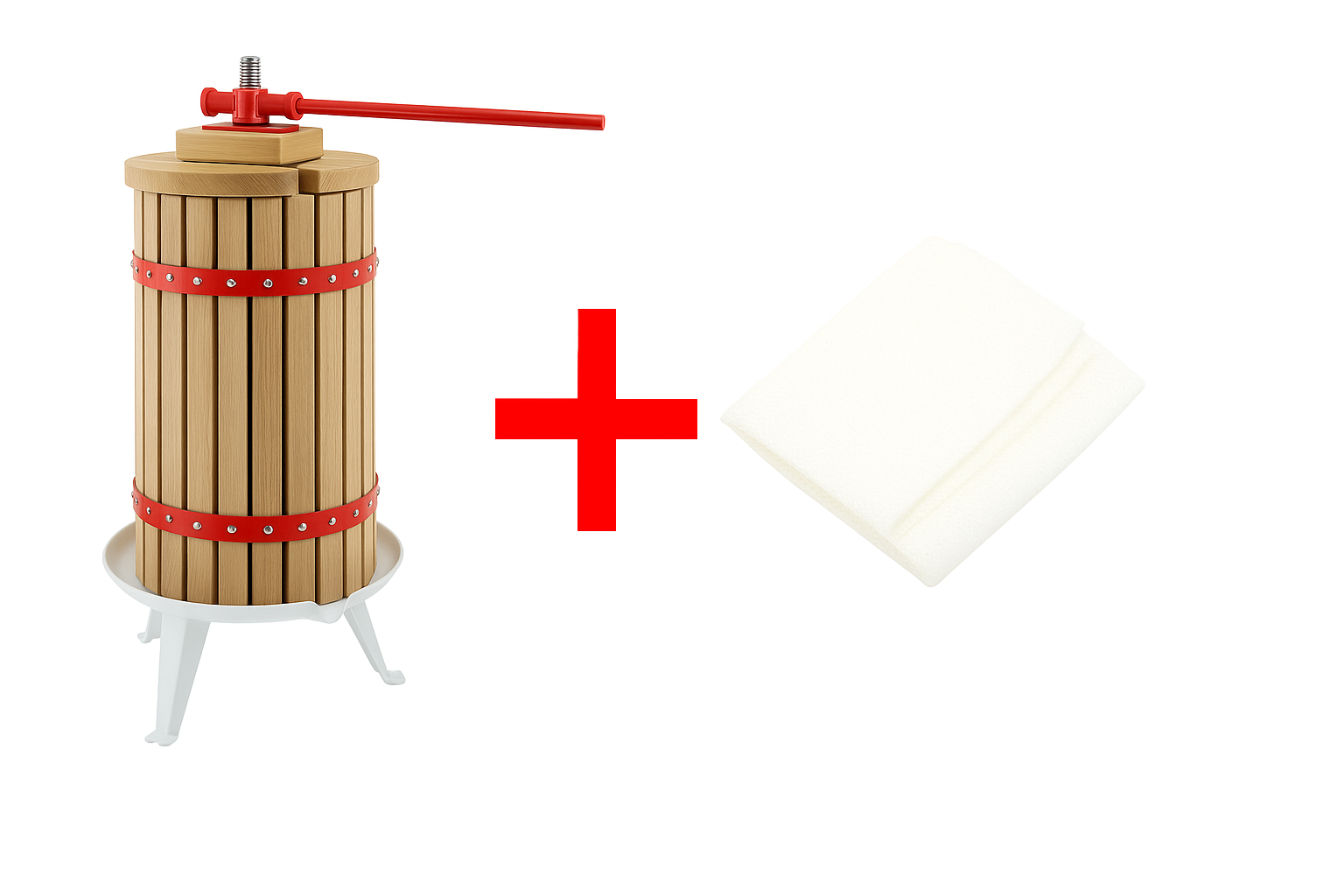 Pachetul contine presa manuala Elefant FP-30 din lemn masiv de stejar si sacul textil de 30 litri pentru filtrare. Este solutia ideala pentru gospodarii care doresc sucuri naturale din mere, pere, struguri sau fructe de padure. Presa are structura robusta din stejar, fonta si otel, iar sacul retine pulpa si semintele, oferind un suc curat si limpede.
