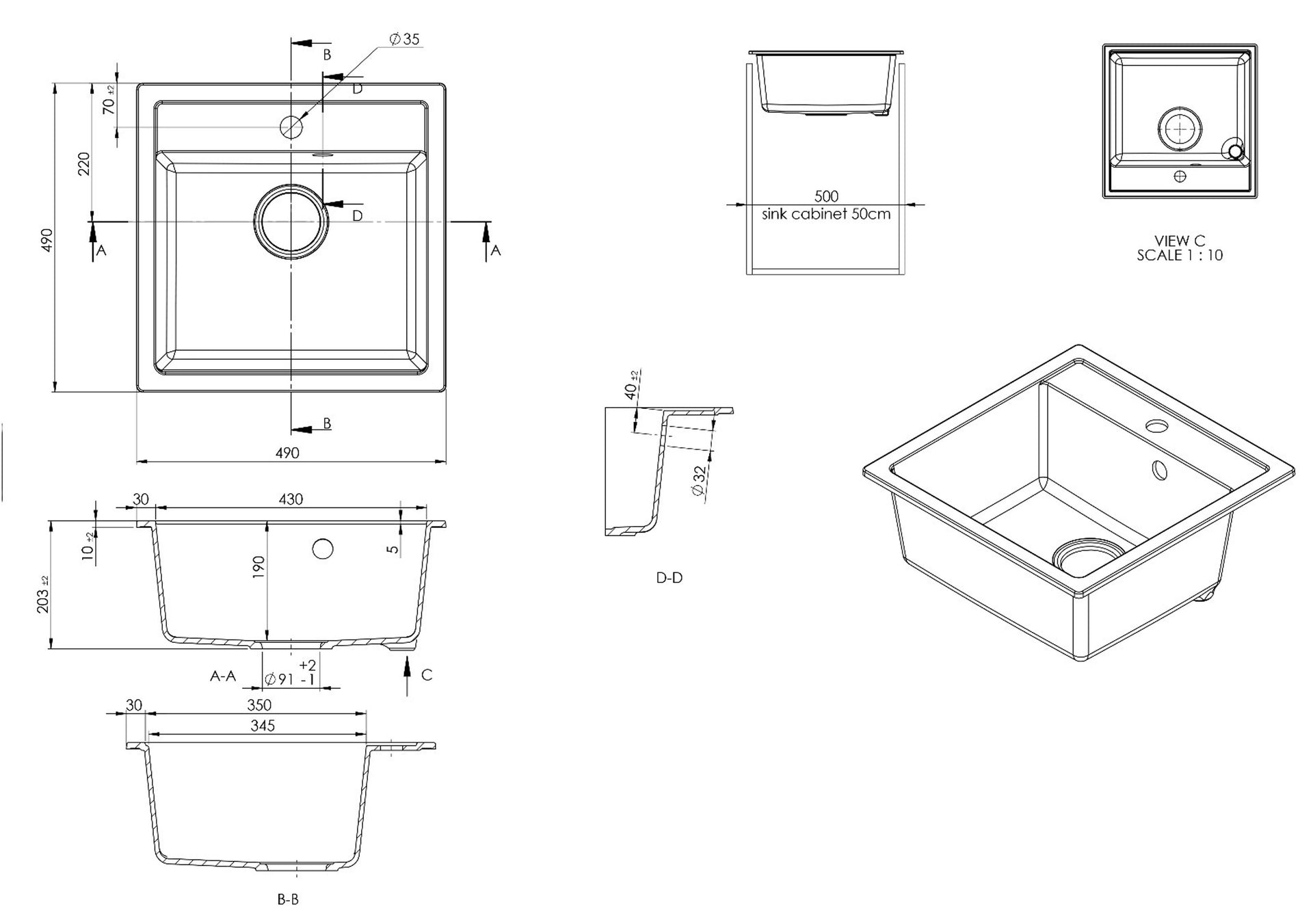 Are o forma patrata, cu o singura cuva adanca de 200 mm, cu dimensiunea de 490x490mm.