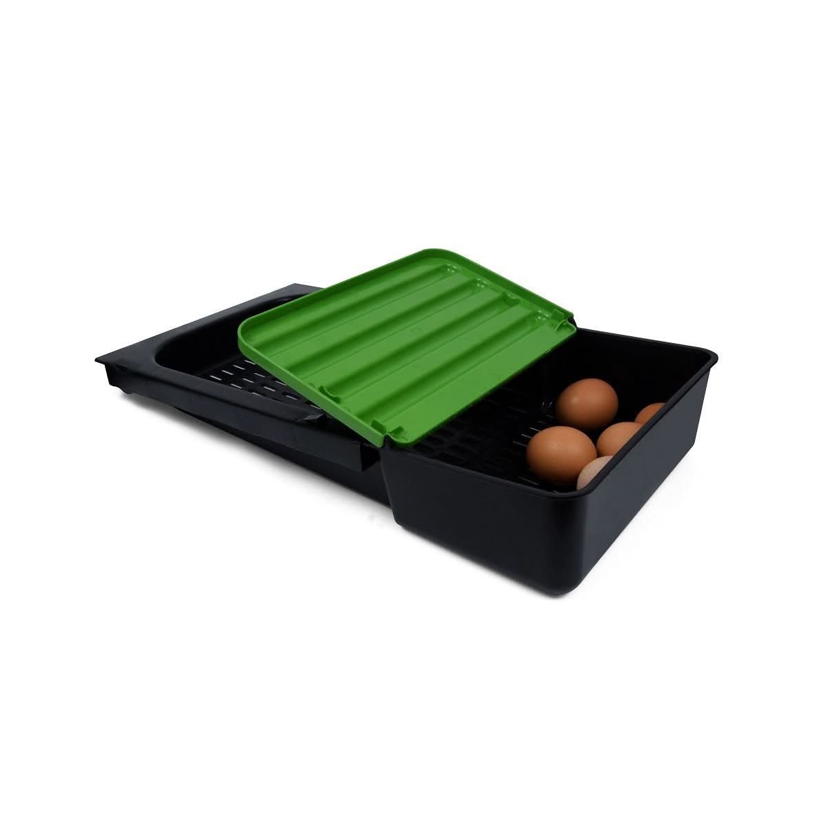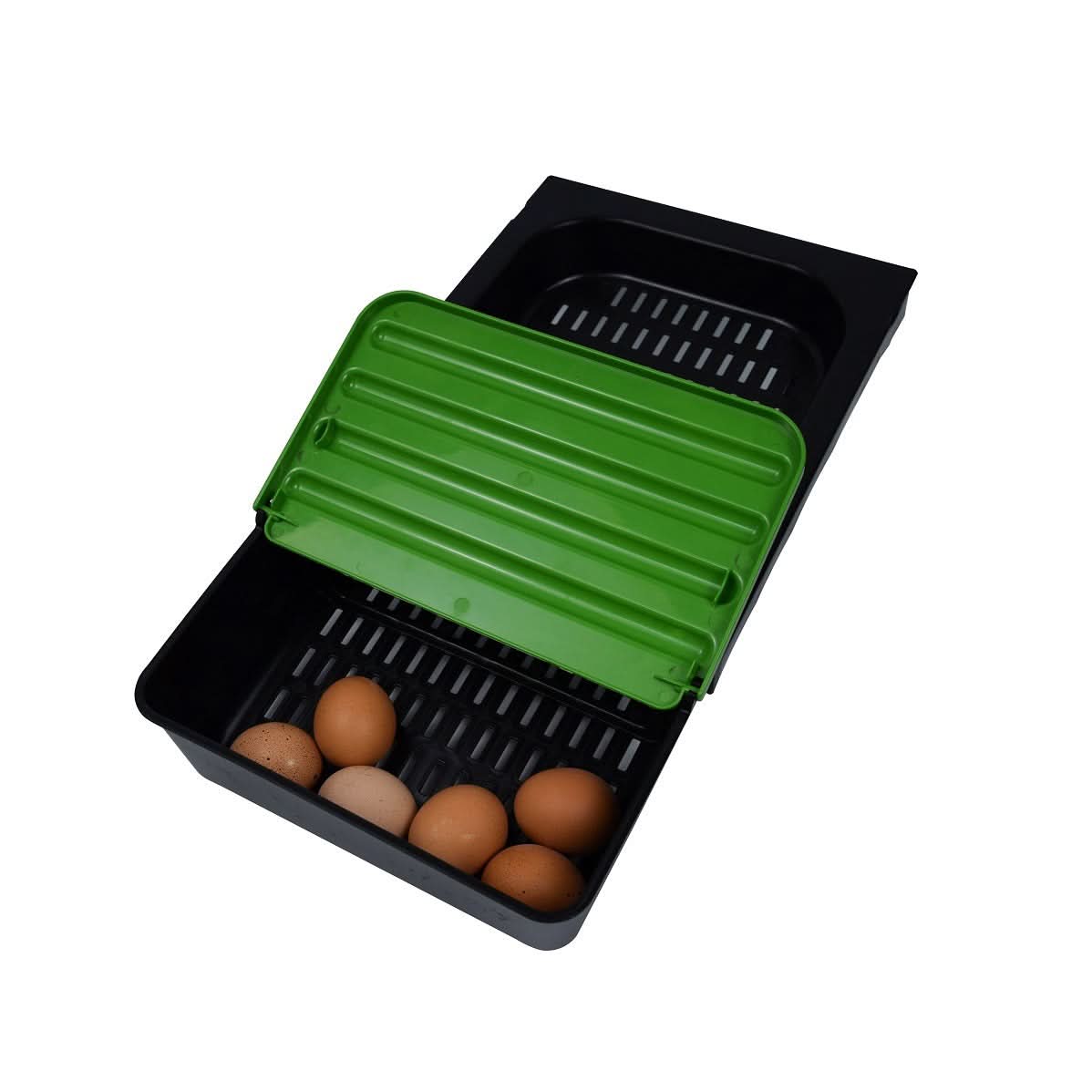 Tava pentru cuibarul de gaini a fost special creata pentru gainile "rebele" care mananca ouale. Utilizand aceasta tava oul se rostogoleste pana in separeul unde gaina nu reuseste sa ajunga. Prin urmare oul ramane intact.