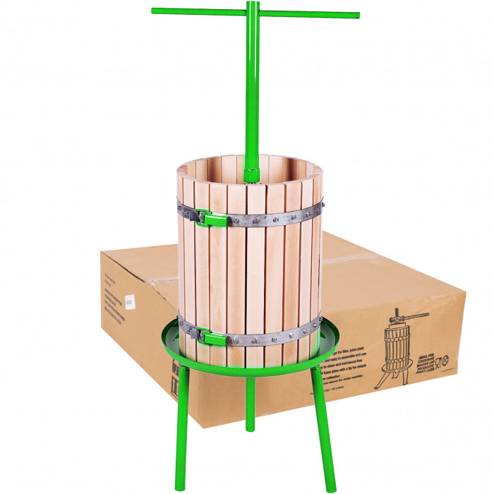 Cosul este realizat din lemn de esenta tare, format din 2 bucati cu balama, usor de montat si demontat. Suportul este metalic, vopsit pentru protectie impotriva ruginii, iar axul filetat M24 si maneta de actionare asigura o presare eficienta. Mustul rezultat se scurge direct prin tava metalica prevazuta cu orificiu de evacuare.