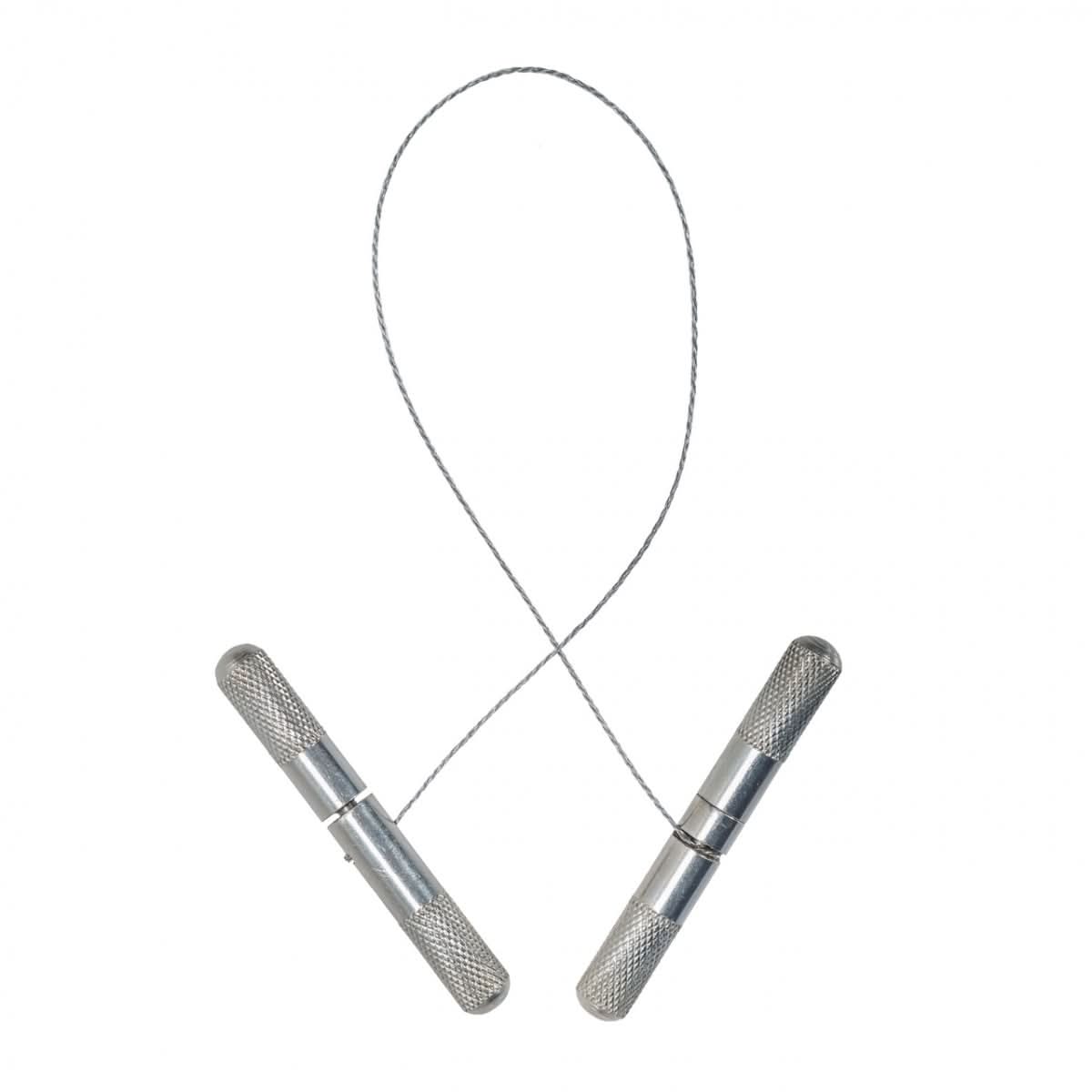 Set de mânere metalice pentru ferăstrău tip cablu, special conceput pentru tăierea coarnelor bovinelor adulte. Aceste mânere sunt robuste și durabile, oferind o utilizare eficientă și confortabilă. Sârma de oțel pentru ferăstrău se vinde separat, disponibilă în cantități de 3,6 și 12 metri.