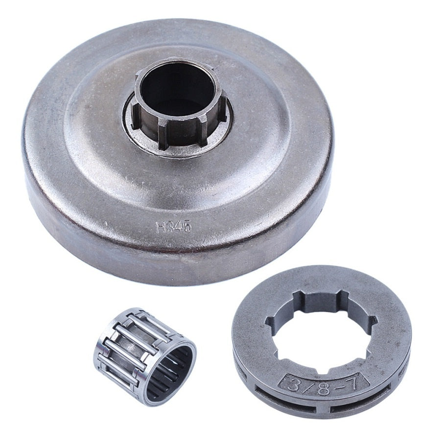 Oala ambreiaj drujba + rotita motrica detasabila + colivie Se potriveste pentru drujba Husqvarna 340, 345, 346, 346XP, 350, 351, 353, 355, 357, 357xp, 359. Dimensiuni: Inaltime oala: 27.7mm; Diametru interior: 69mm; Dimatru interior ax: 16mm Pas 3/8. Sabotii pentru: Husqvarna 340, 345, 346, 350, 351, 353: aici . Husqvarna 357, 359: aici .