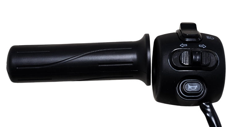 Acceleratie + comenzi lumini scuter electric Maneta de acceleratie se livreaza cu butonul de selectare a treptei de viteze (3 trepte), cu butonul de lumini si cu butonul de pornire cu urmatoarele fire: o mufa cu 5 fire si 2 mufe a cate 3 fire. Maneta cu blocul de lumini are butonul de lumini, butonul de semnalizare si claxonul cu urmatoarele fire: o mufa cu 8 fire. Se poate monta pe ghidoane cu diametru de 22mm