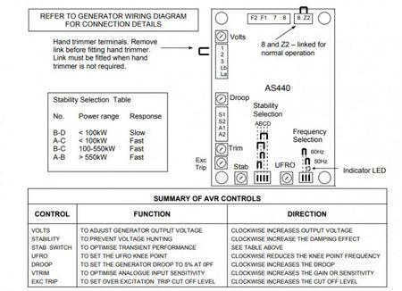 AVR Generator model AS440 . Regulator automat de voltaj AS440 controlat in faza cu jumatate de unda face parte din sistemul de excitatie pentru generatoare trifazice fara perii. Pe langa reglarea tensiunii generatorului, circuitul AVR include protectia impotriva pierderilor sub viteza si senzor pentru a asigura un control sigur si fiabil al generatorului.