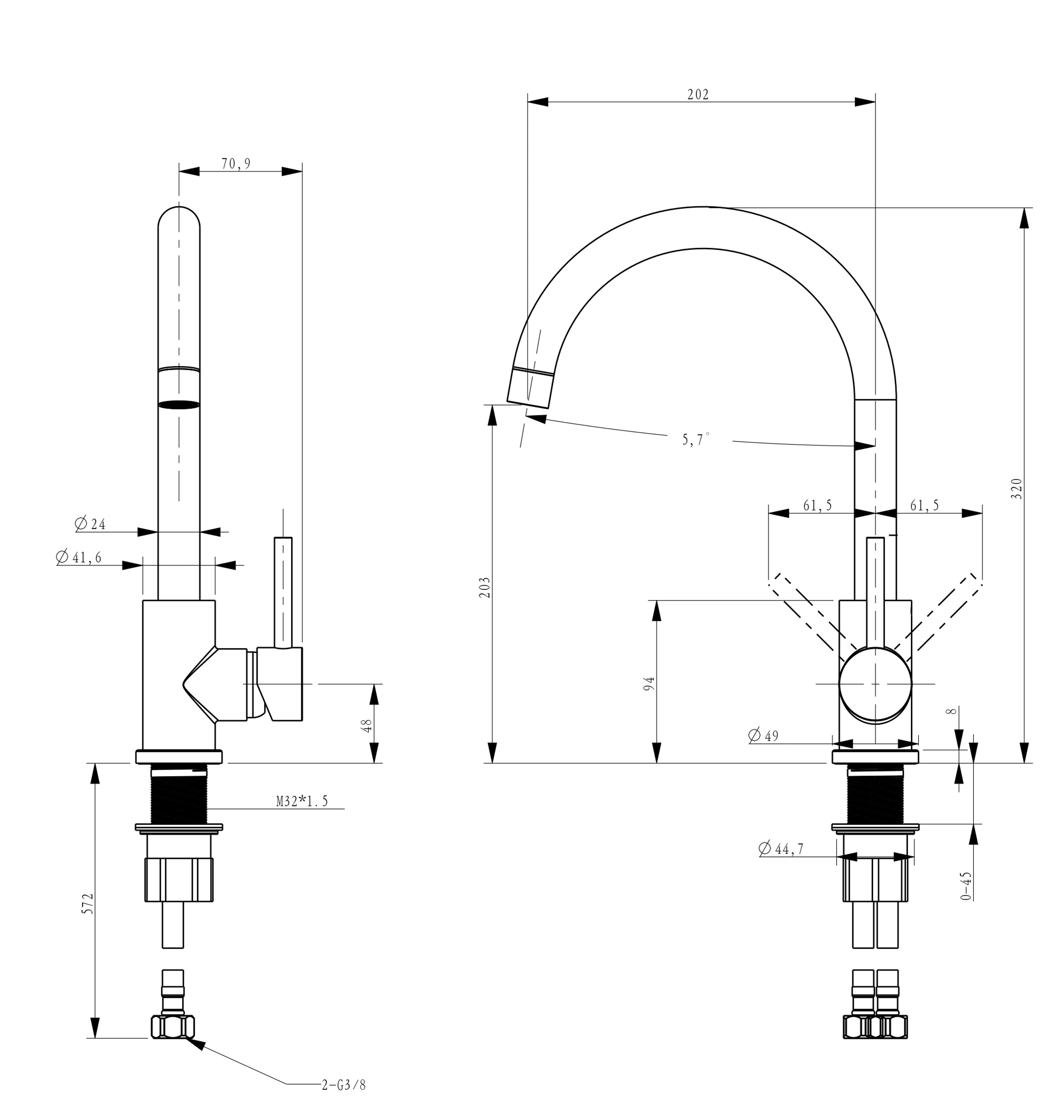 Dispune de un aerator integrat pentru un consum eficient de apă și este livrată împreună cu furtunuri de racordare flexibile, lungi de 45 cm.