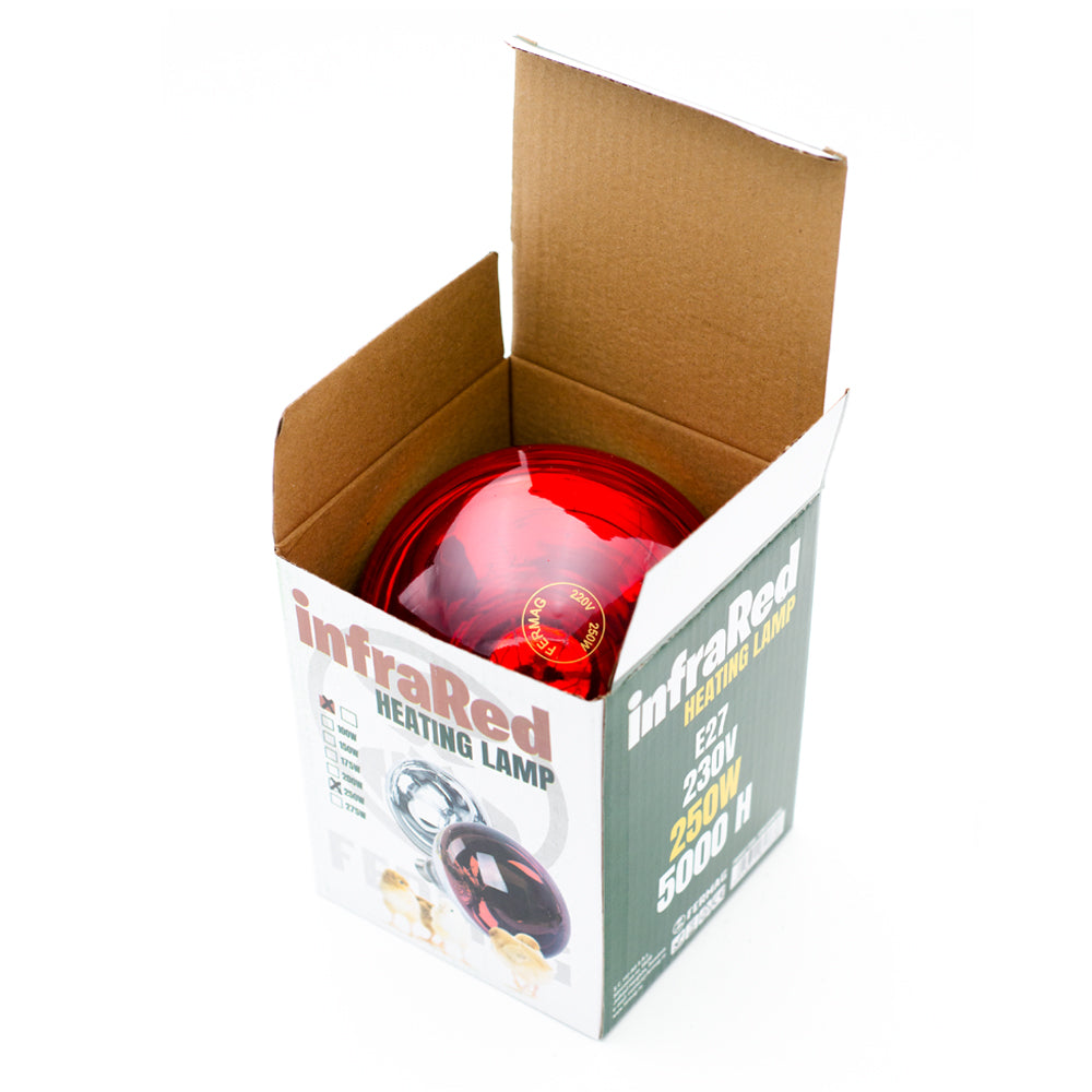 Becul infrarosu PROFESIONAL Fermag de 250 W este conceput pentru incalzirea eficienta a adaposturilor destinate animalelor mici precum pui, purcei, miei sau iezi. Ofera caldura directa si constanta, fara a crea curenti de aer, contribuind la mentinerea unei temperaturi optime pentru crestere si recuperare.
