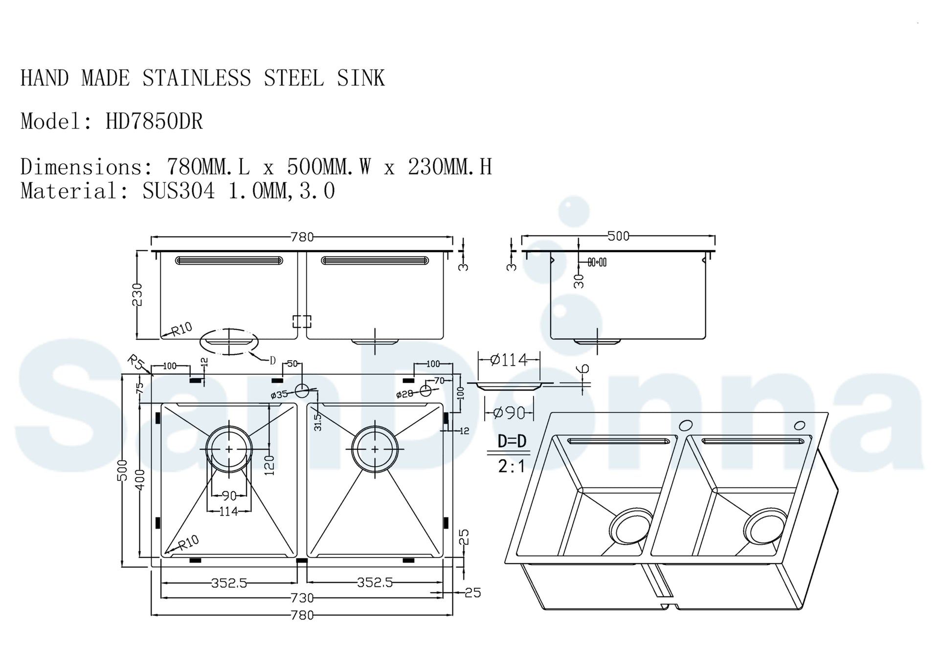Chiuveta de bucatarie handmade Sandonna HD7850DR din inox cu 2 cuve, tavite si dispenser de sapun + Baterie flexibila Sandonna Mona crom