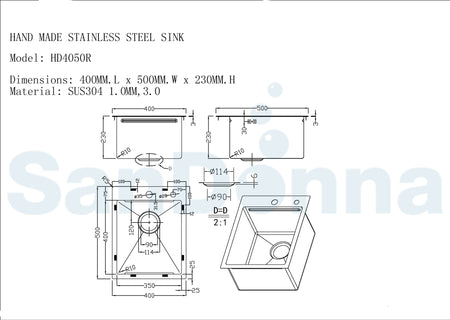 Chiuveta de bucatarie Sandonna HD4050 din inox cu tavita si dispenser + Baterie Andra auriu-alb + Ustensile de gatit din bambus Chiuveta HD4050 este fabricata manual din inox de cea mai inalta calitate tip AISI304, cu grosimea 1 mm cuva / 3 mm marginea superioara. Are o forma dreptunghiulara, cu o singura cuva adanca de 230 mm, cu dimensiunea de 350x400 mm Dimensiune totala: 400×500 mm. Principalele proprietati ale acestui tip de material: • Autenitic, amagnetic, antiseptic si antifungic, • Rezistent la socuri mecanice, temperaturi inalte, agenti corozivi si impotriva ruginii. Modelul are un design estetic modern, potrivit pentru orice stil de bucatarie. Chiuveta este ambalata individual si vine insotita de dozator sapun, scurgator, cleme, sifon. Baterie bucatarie SanDonna ANDRA, cu pipa flexibila, cu suport de fixare, 2 functii de curgere, fabricata din alama. Bateria are dus flexibil foarte de practic si confortabil de utilizat Aceasta baterie faciliteaza mentinerea curateniei in jurul chiuvetei, umplerea vaselor inalte si spalarea legumelor cu usurinta.Instalarea este rapida si simpla, datorita furtunurilor de racordare lungi incluse in set, care economisesc timp si asigura o functionare optima. Set ustensile de bucatarie din bambus format din 7 piese Acest set include 6 spatule + suport din lemn de bambus Dimensiuni ustensile: 29 cm lungime Material: Ustensilele sunt realizate din lemn de bambus natural, un material ecologic și regenerabil, perfect pentru vasele de gătit cu strat antiaderent. Acestea nu vor deteriora stratul antiaderent al vaselor tale. Întreținere: Spatulele din bambus sunt ușor de curățat, se pot spăla cu apă caldă și săpun delicat.