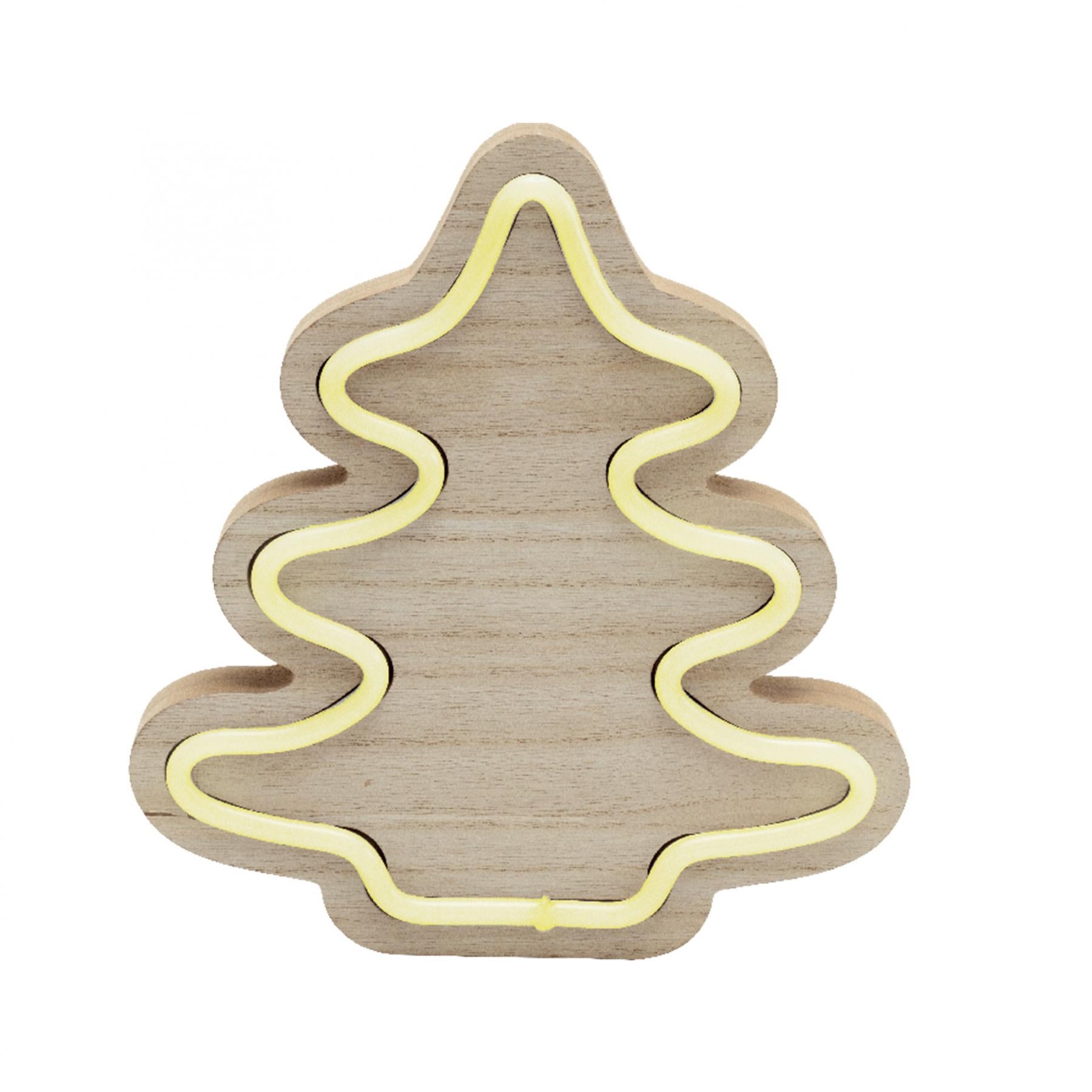 Decor Masa LED Brad din Lemn 23 cm, Neon Light Alb Cald, Banda LED, Alimentare 3xAAA – KAD 28