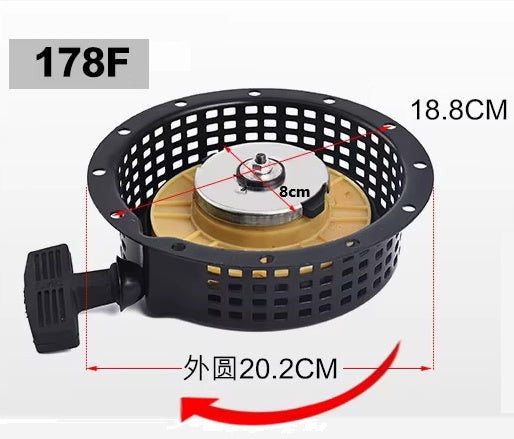 Demaror motosapa generator diesel (motorina) Yanmar LA70, 178F Inaltime 60mm; Diametru inel tractiune 80mm Distanta intre prinderi 186mm Mentionam faptul ca produsul nu este original, insa este compatibil pentru modelele enumerate mai sus . Cod OEM: 6217-23070 Poza informativa.