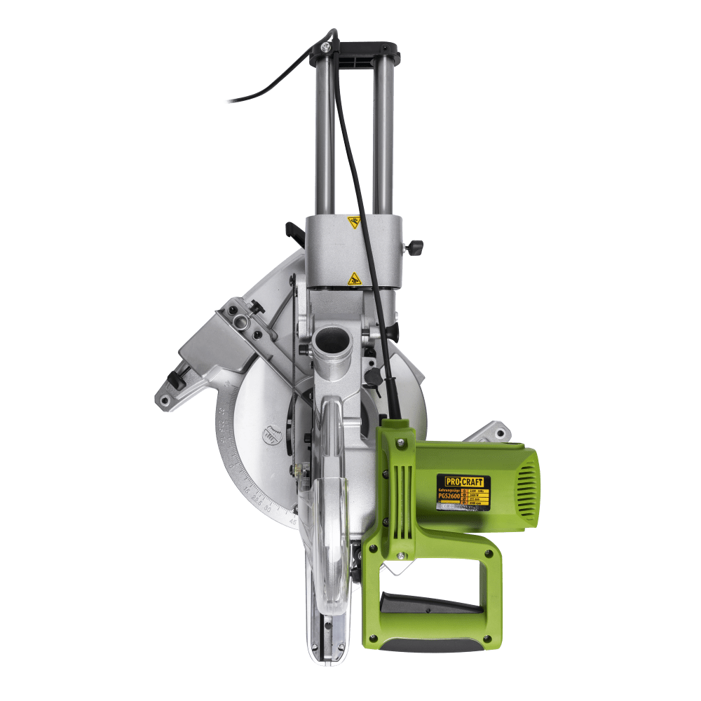 Bratul cu panza si motorul este fixat pe doua sine tubulare care permit miscari verticale si orizontale prin glisare. Reglajul unghiului de taiere este posibil pana la 45°, cu scala de ghidare pentru precizie sporita. Sistemul dublu de eliminare a prafului mentine zona curata, iar blocarea axului faciliteaza schimbarea rapida a discului.