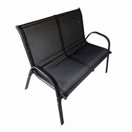 Structura din otel vopsit rezistent garanteaza durabilitate si stabilitate, iar suprafetele din material textilen respirabil asigura confort chiar si in zilele calduroase. Masa este prevazuta cu blat din sticla securizata, usor de curatat si cu un aspect modern.