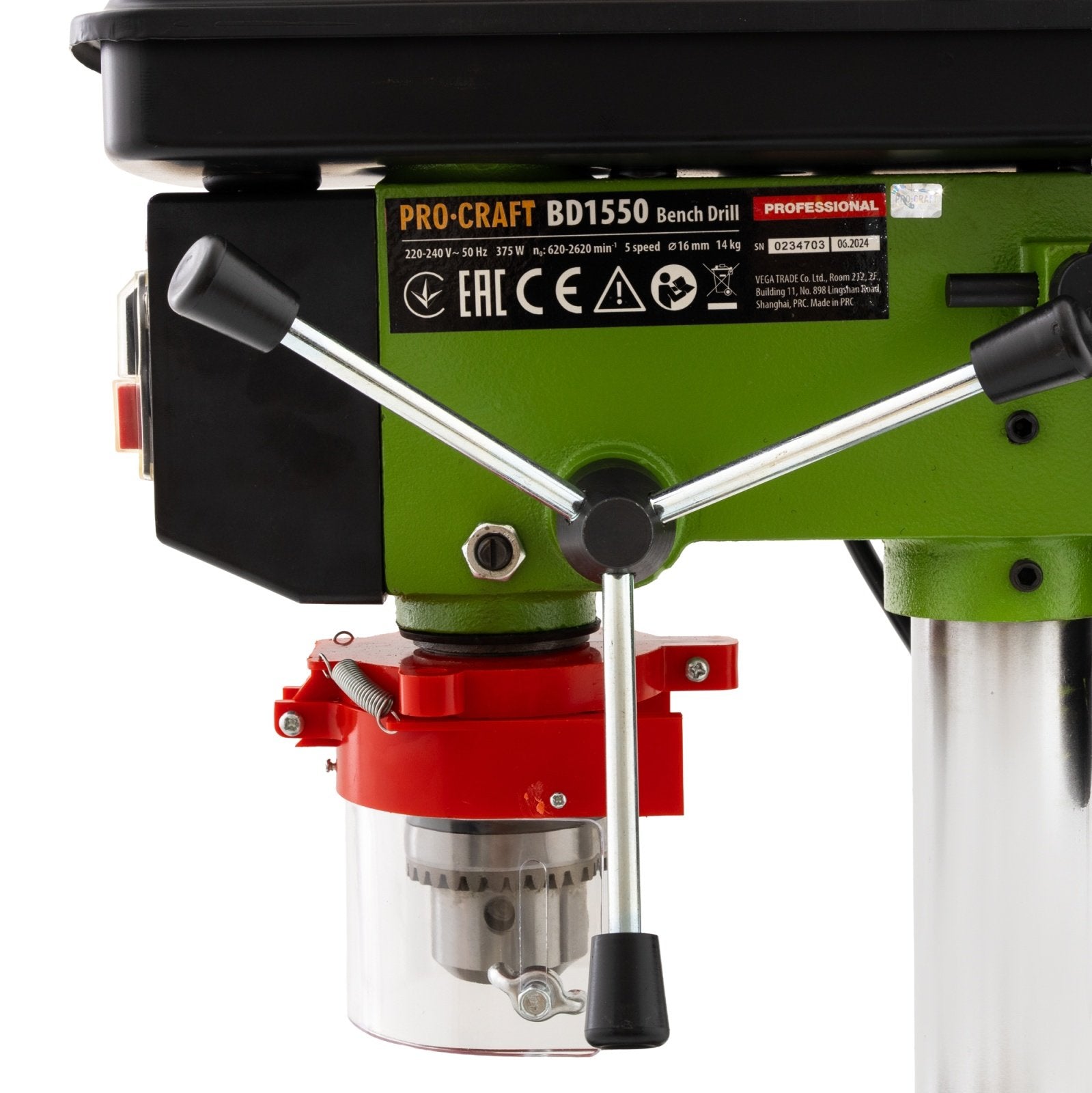 Masina de gaurit de banc Procraft BD1550, 375W, 16 mm, 5 viteze, cursa 50 mm, mandrina cu bacuri, menghina 55 mm