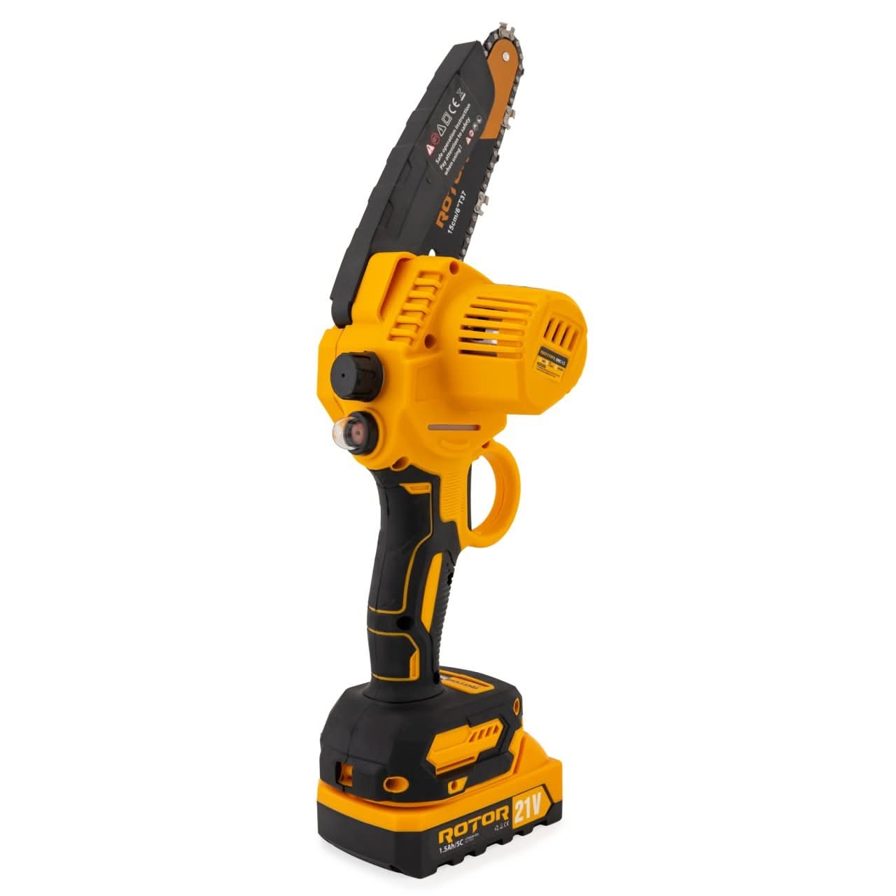 Mini fierastraul ROTOR RMC-1.5 este ideal pentru taieri rapide in lemn, crengi si materiale usoare. Alimentat de un acumulator Li-Ion de 21V / 1.5Ah, ofera mobilitate maxima si independenta fata de cabluri. Motorul cu perii de 500W atinge 4500 rot/min, asigurand performanta constanta pentru uz casnic sau hobby.