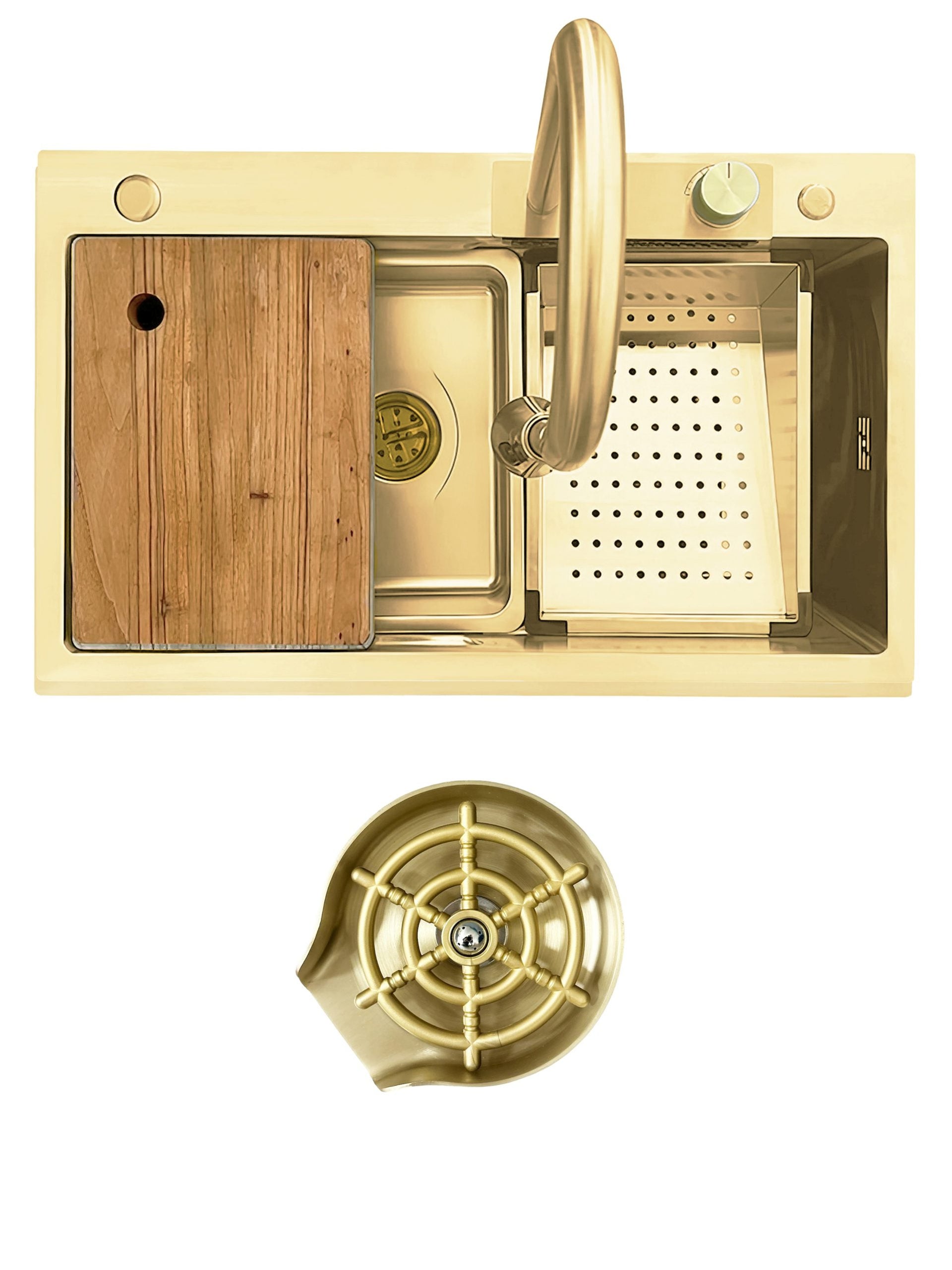 PACHET Chiuveta de bucatarie multifunctionala handmade din inox Sandonna HD6850 cu baterie, tavite de scurgere si dispenser de sapun + spalator de pahare - Auriu