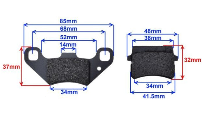 Dimensiune placuta mare: 84.9mm x 42.4mm x 7mm Dimensiune placuta mica: 47.4mm x 37mm x 9.2mm Placute de frana pentru urmatoarele marci de scutere si Atv-uri: Adly Aeon CPI Eppella Herculles Hyosung Italjet Keeway Motomojo Muz PGO Pegasus Peugeot Qianjiang Qingqi Suzuki TGB TNG Vento ZIP