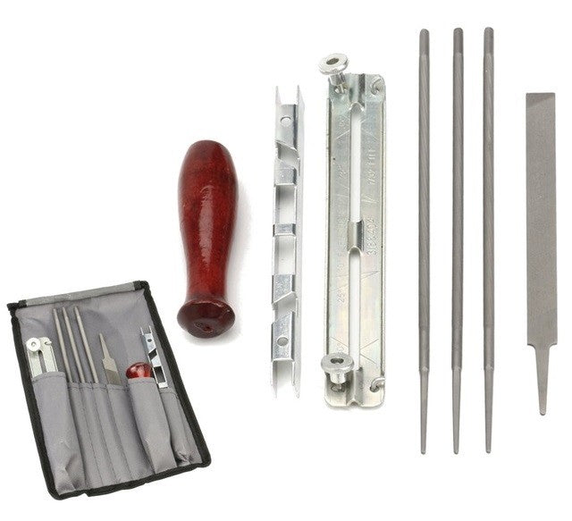 Trusa pentru ascutit lant drujba Setul cuprinde : 3 pile rotunde cu diametre diferite: 4, 4.8, 5.5mm o pila lata ghidaj pentru pila ghidaj pentru lant maner pentru pila din lemn