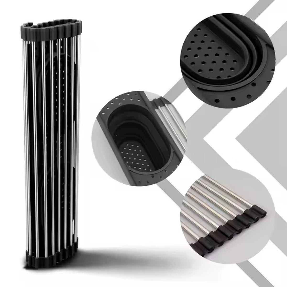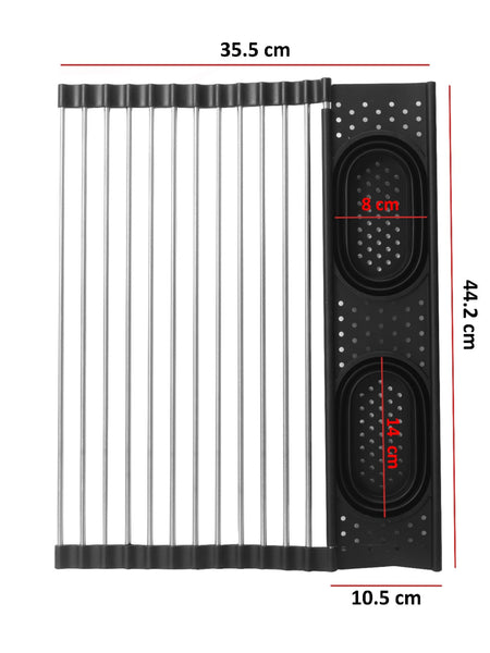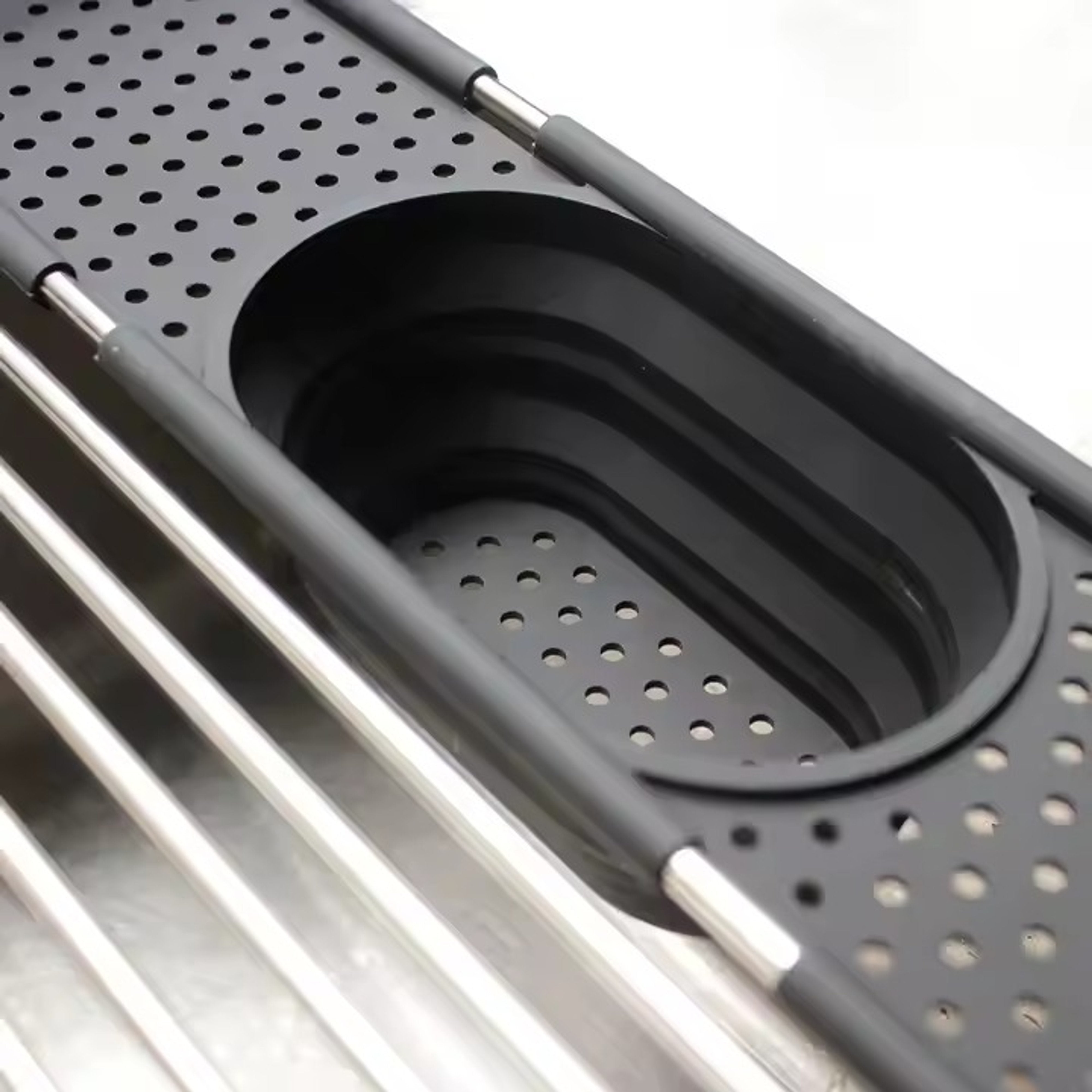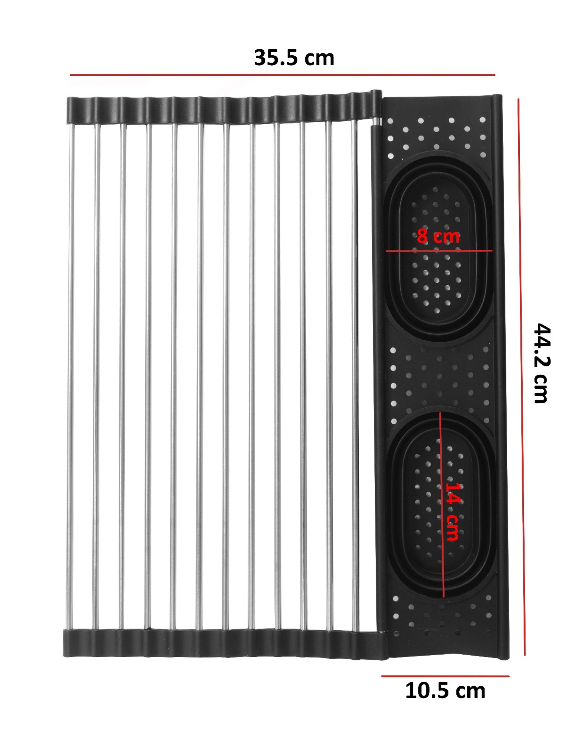Scurgător multifuncțional pentru chiuvetă, realizat din oțel inoxidabil, prevăzut cu 13 tije rezistente. Scurgător multifuncțional pentru chiuvetă, realizat