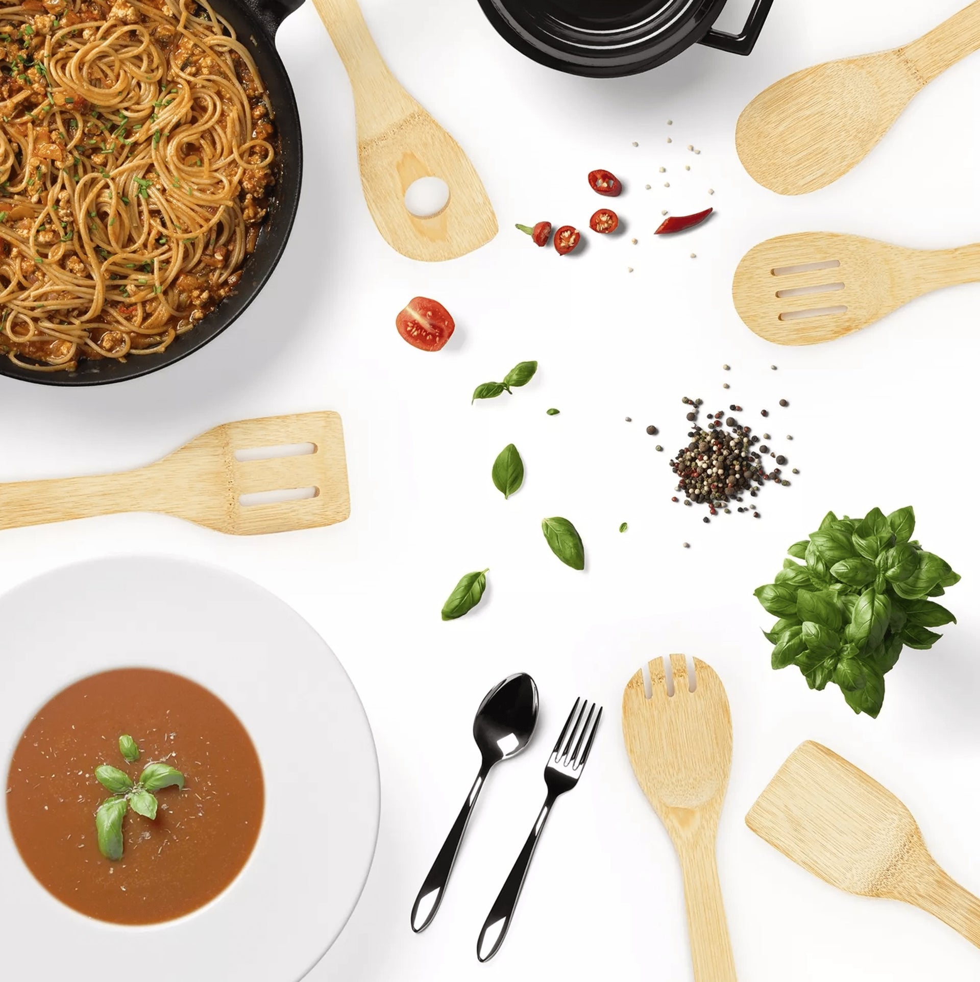Ustensilele sunt realizate din lemn de bambus natural, un material ecologic și regenerabil, perfect pentru vasele de gătit cu strat antiaderent.