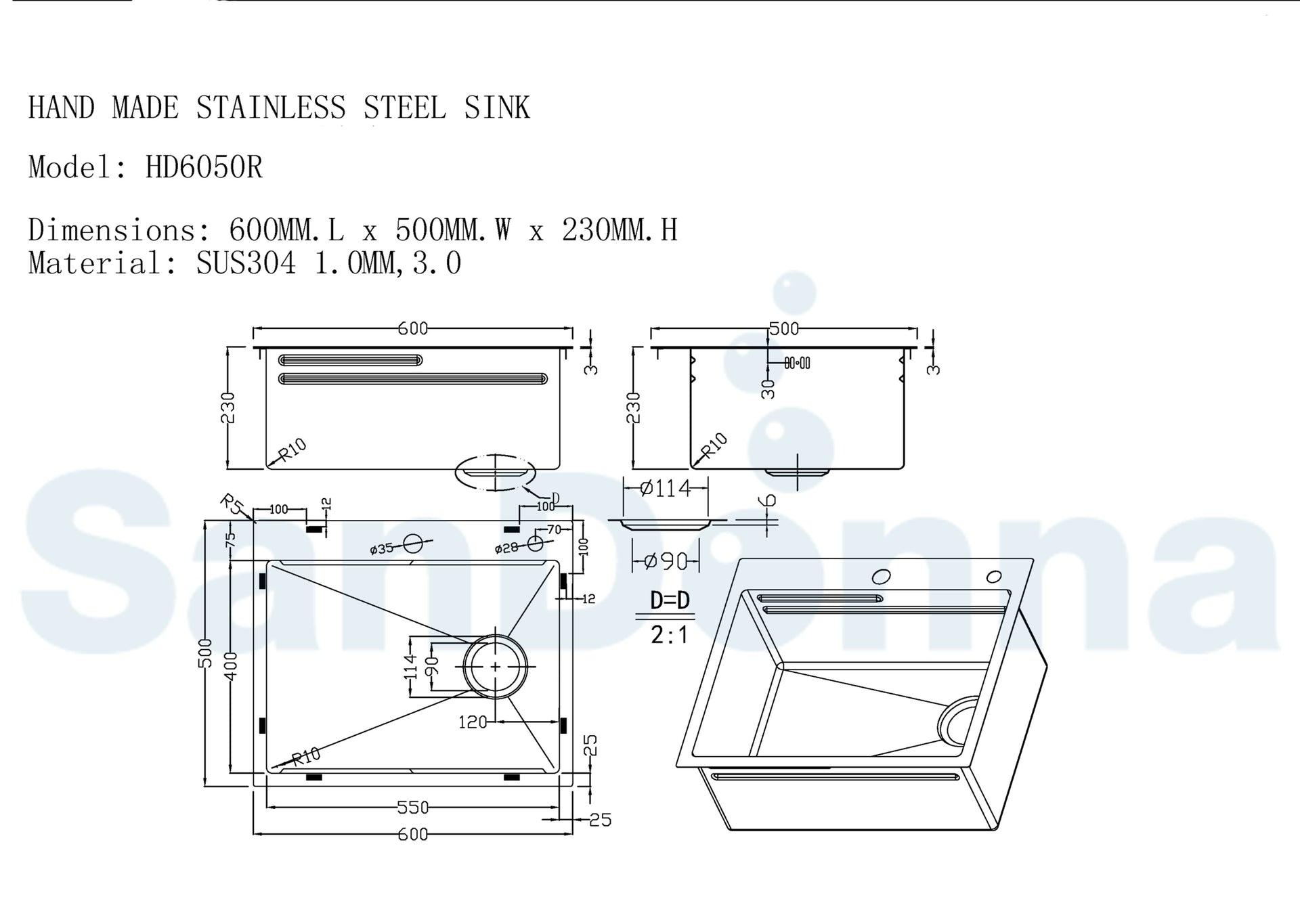 Chiuveta HD6050 este fabricata manual din inox de cea mai inalta calitate tip AISI304, cu grosimea 1 mm cuva / 3 mm marginea superioara.