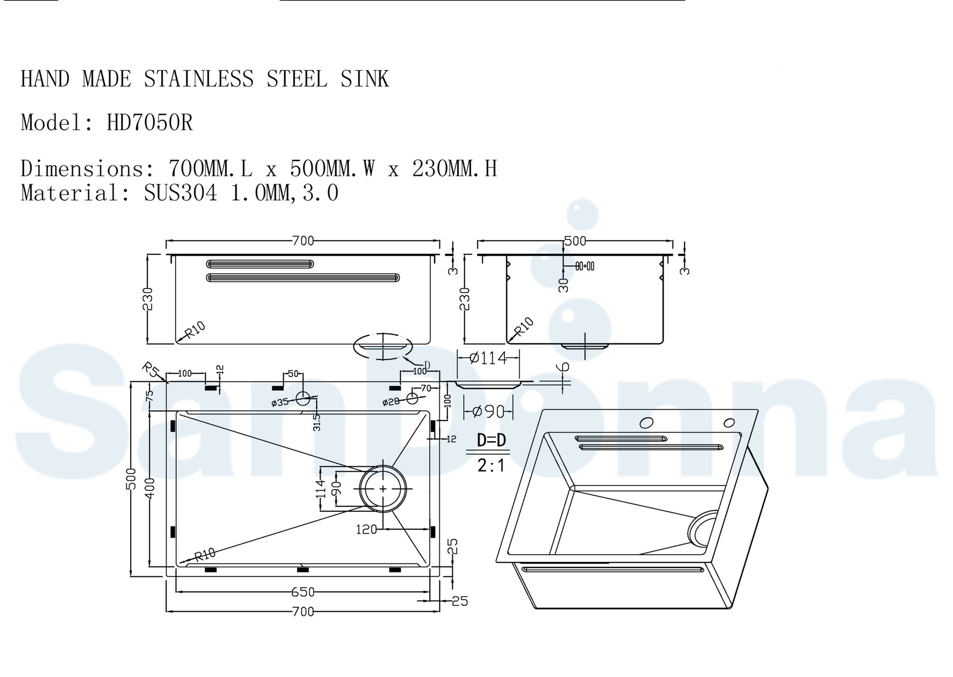 Chiuveta HD7050 este fabricata manual din inox de cea mai inalta calitate tip AISI304, cu grosimea 1 mm cuva / 3 mm marginea superioara.