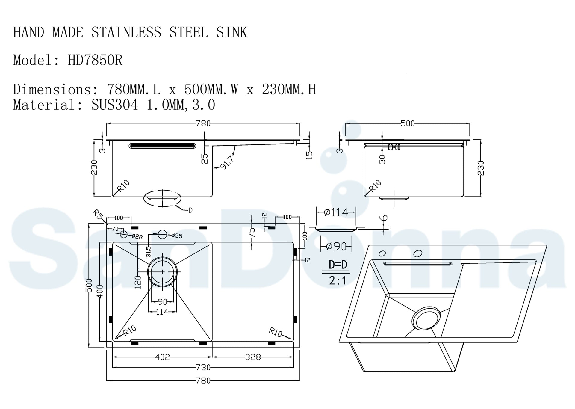 Chiuveta HD7850 este fabricata manual din inox de cea mai inalta calitate tip AISI304, cu grosimea 1 mm cuva / 3 mm marginea superioara.