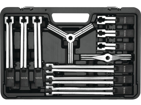 Setul profesional de 12 piese pentru extractia rulmentilor, fulilor si rotilor dintate este ideal pentru ateliere, service-uri auto si lucrari mecanice. Componentele permit asamblarea extractoarelor cu doua sau trei brate, atat pentru variante interne, cat si externe, cu lungimi de 100, 200 si 250 mm, asigurand versatilitate si precizie in demontare. Fabricat din materiale rezistente, ofera durabilitate si siguranta in utilizare.