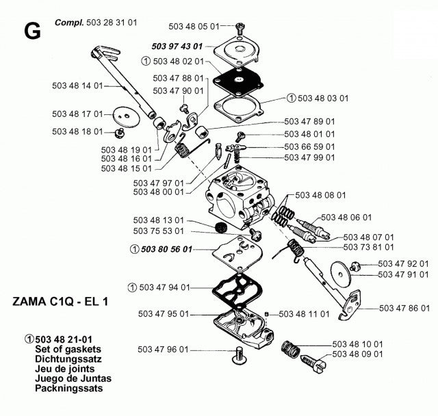 Set membrane carburator drujba Husqvarna 40, 51, 55 Alte compatibilitati: Husqvarna 40, 45, 51, 55, 240R, 245R, 245RX Jonsered CS 2041, 2045, 2050 Cod OEM: 503 48 21-01 Produs original Husqvarna