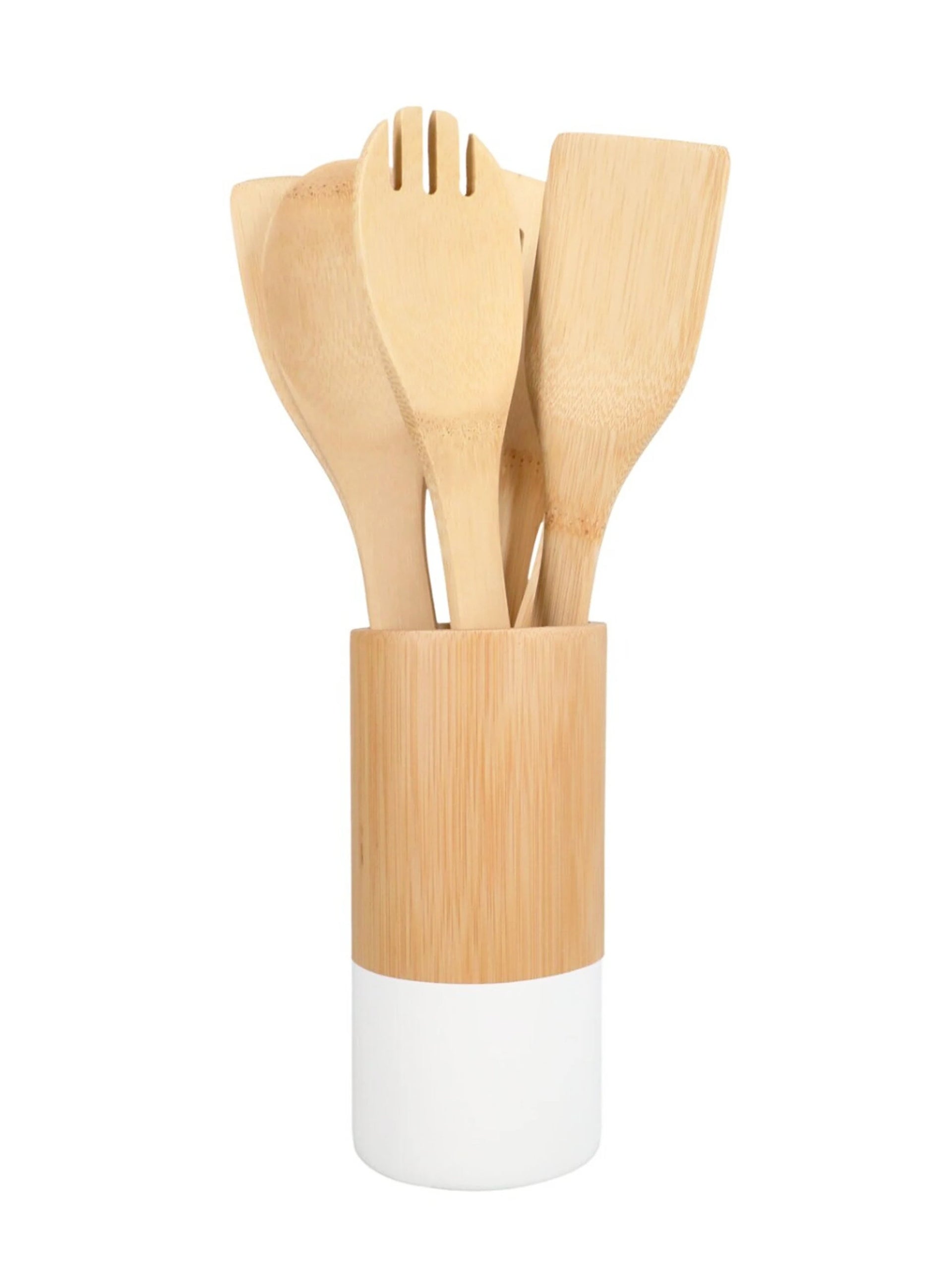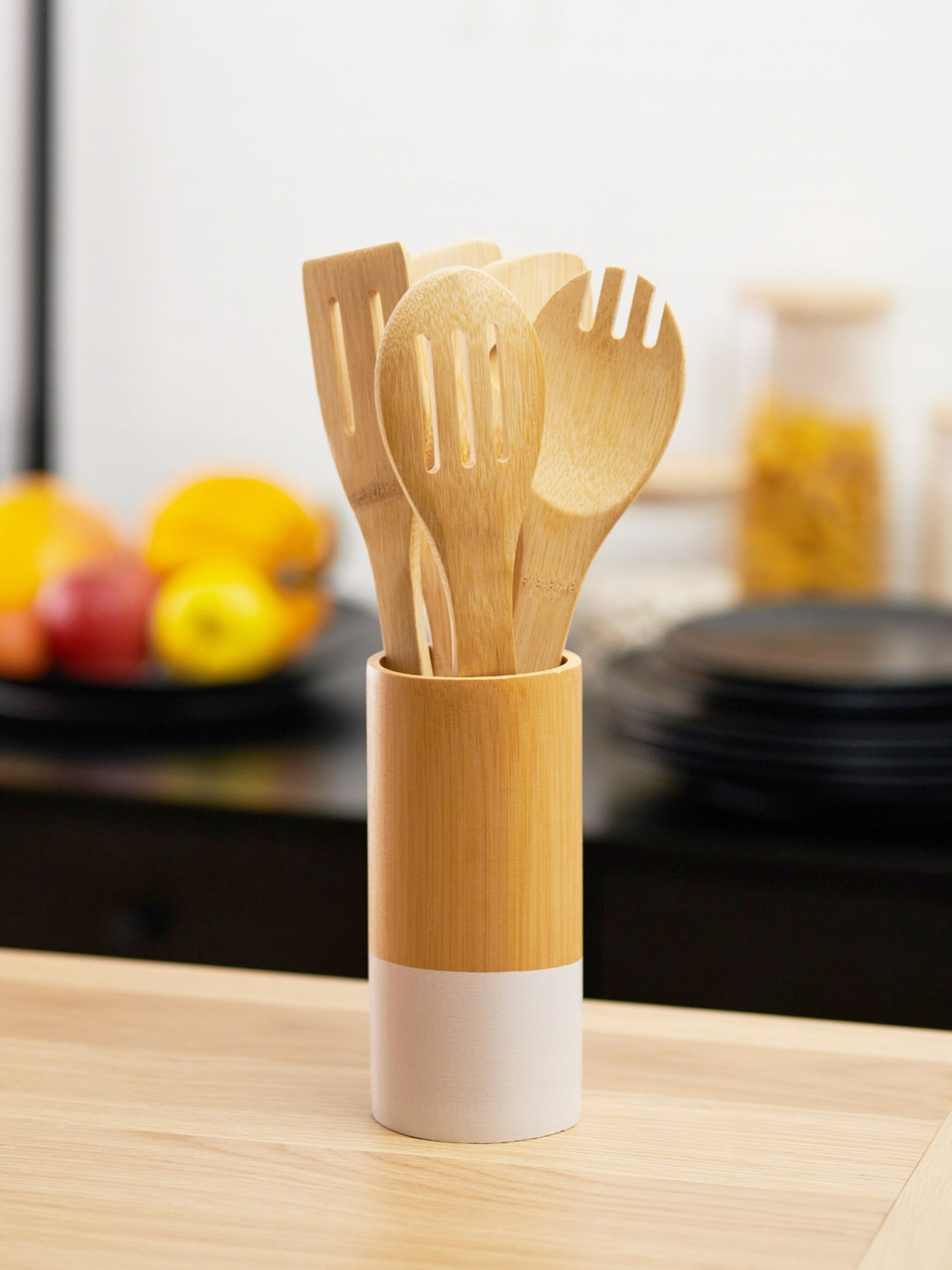 Set ustensile de bucatarie din bambus format din 7 piese Acest set include 6 spatule + suport din lemn de bambus Dimensiuni ustensile: 29 cm lungime … Set
