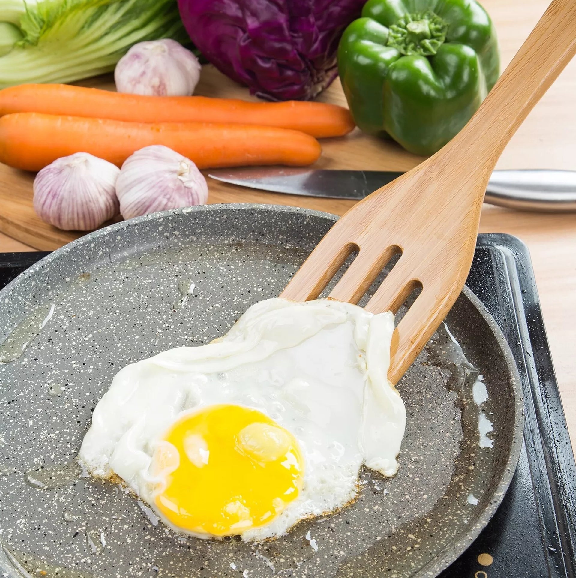 Ustensilele sunt realizate din lemn de bambus natural, un material ecologic și regenerabil, perfect pentru vasele de gătit cu strat antiaderent.