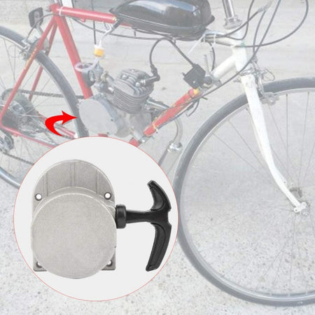 Sistem de pornire la sfoara (demaror) bicicleta cu motor 2 timpi Acest Sistem de pornire se potriveste si la kiturile de bicicleta cu motor in 2 timpi comercializate pe siteul nostru. https: www.generalmotor.ro kit-motor-bicicleta-2-timpi Acest sistem este potrivit pentru biciclete fara pedale sau pentru biciclistii care, din anumite motive, nu pot pedala pentru a porni motorul de bicicleta in 2 timpi. Demarorul se monteaza foarte usor demontand capacul de la magnetou si instaland cele doua componente ale sistemului de pornire la sfoara (cuplajul si demarorul) Nota: instalarea ansamblului de pornire la sfoara adauga aproximativ 4.5 cm la latimea totala a motorului - acest lucru poate impiedica pedalatul (la anumite modele de bicicleta).