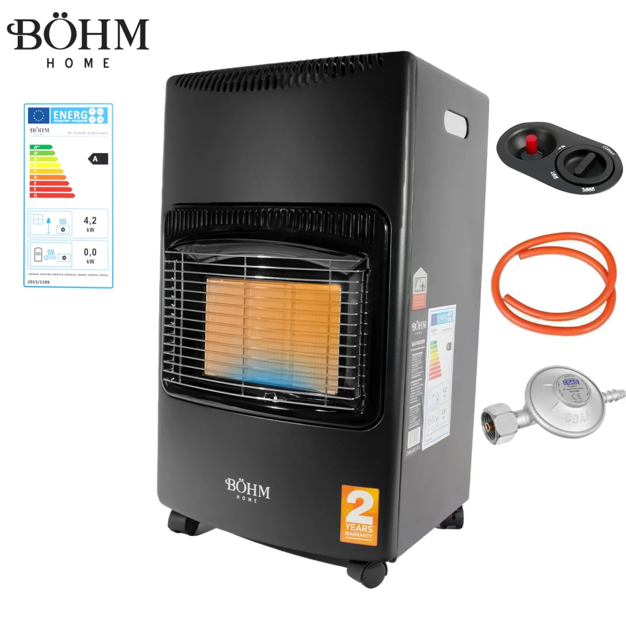 Soba pe gaz GPL BÖHM BF-003A, 4,20 kW, 3 trepte de putere, pentru 20–80 m², cu regulator, furtun 1,5 m si butelie GPL 26 L