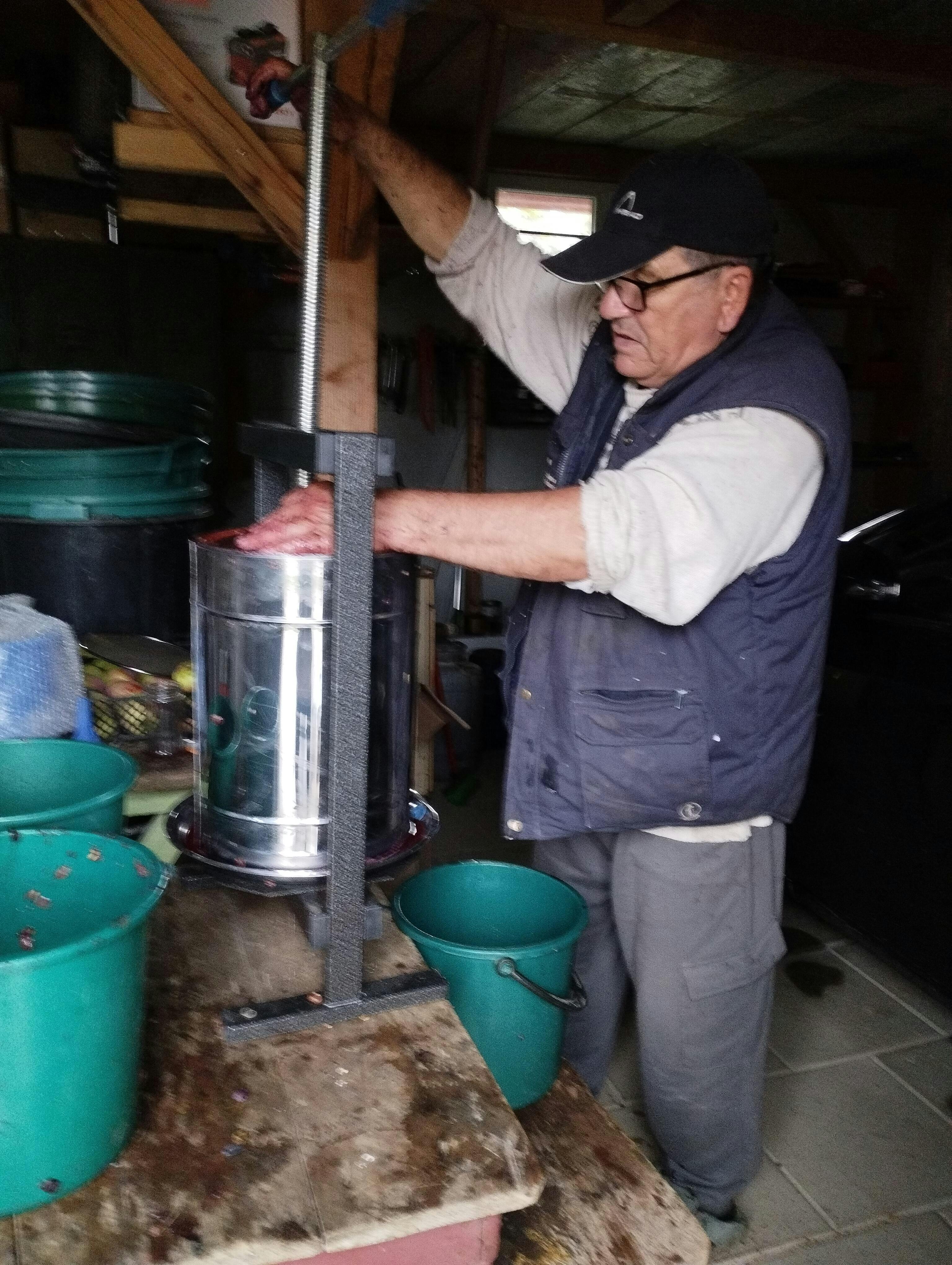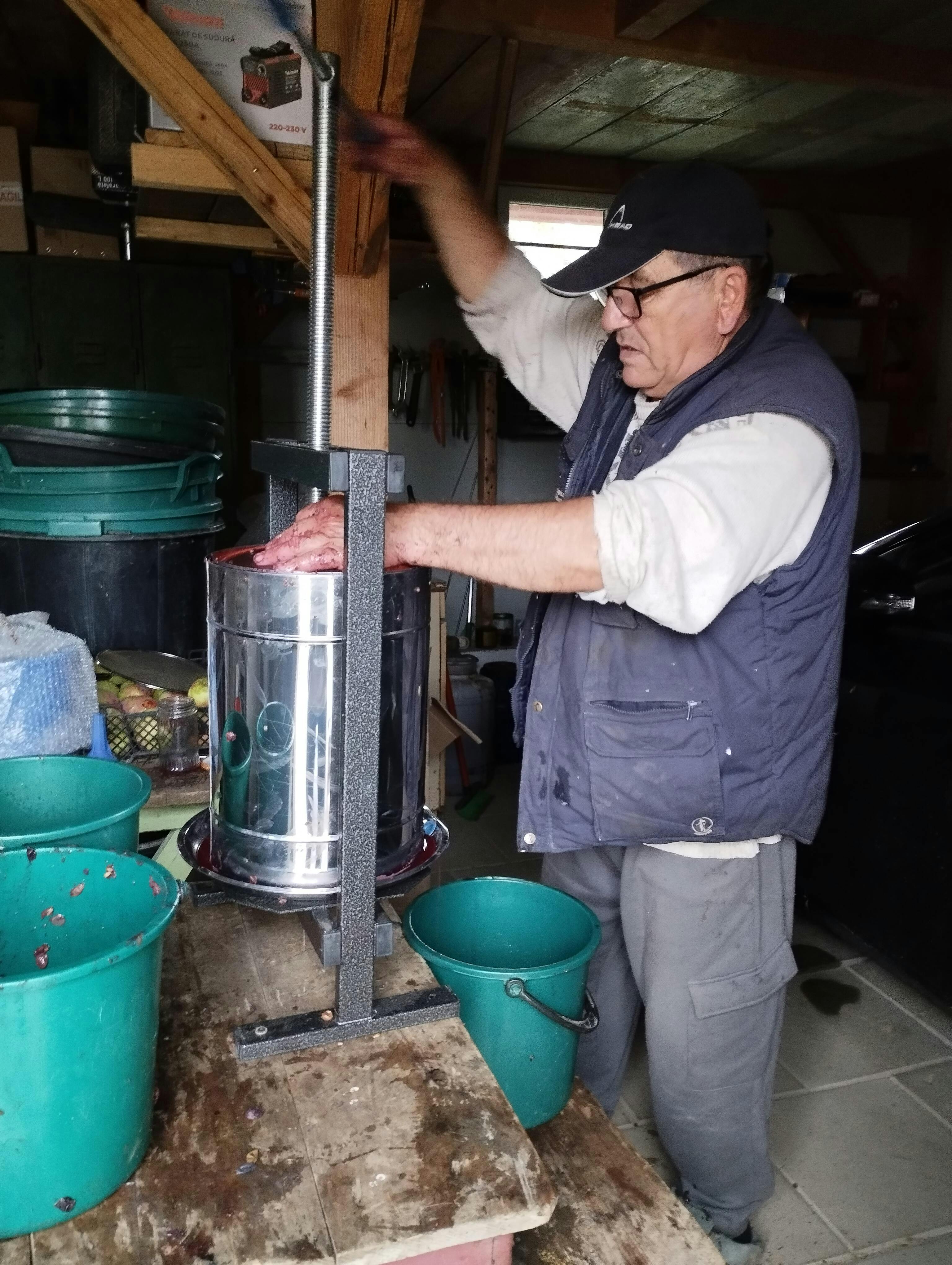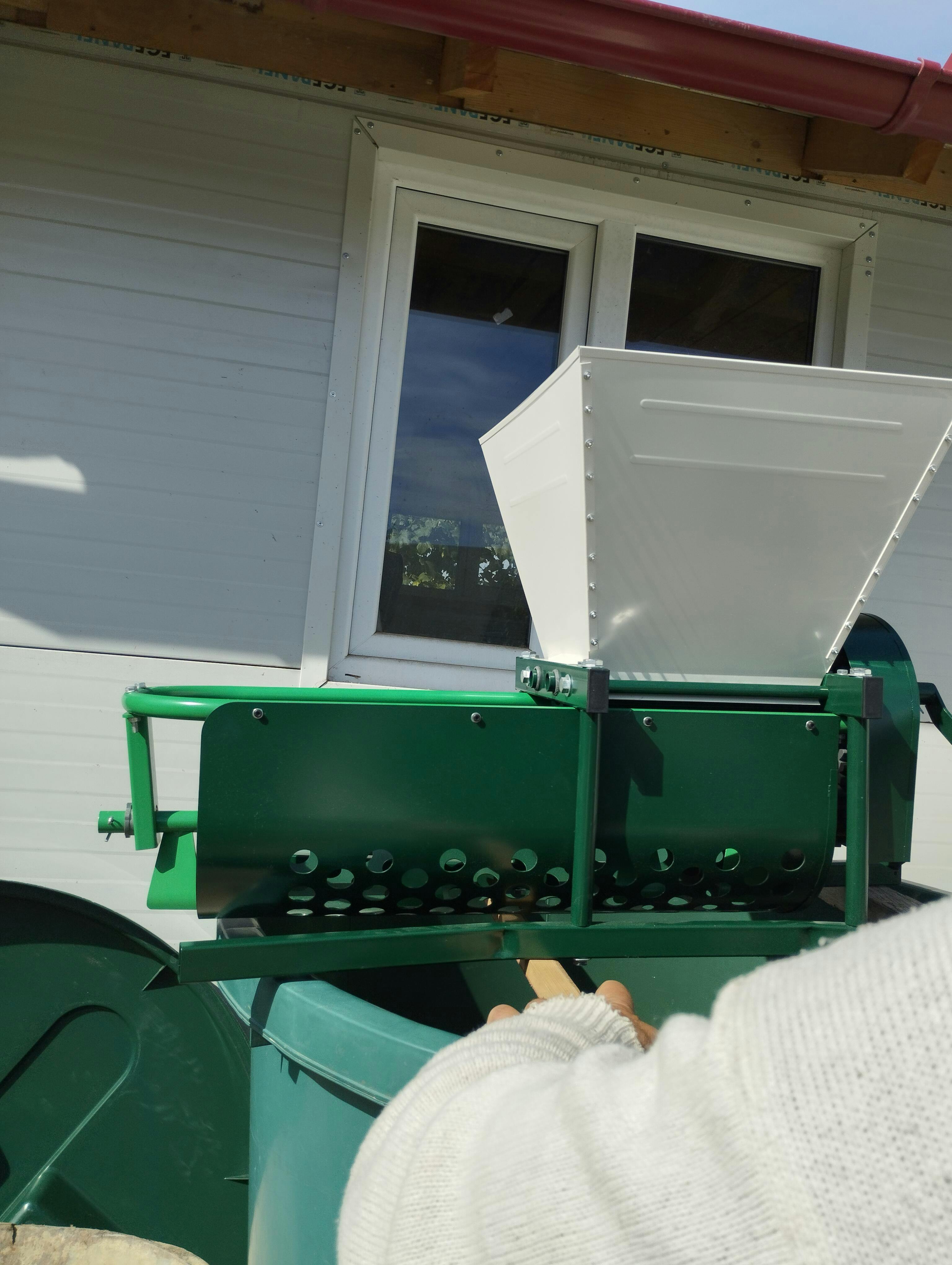 Presarea se face prin rasucirea axului filetat, care actioneaza capacul metalic de presare. Cilindrul perforat permite scurgerea mustului direct in tava de inox cu orificiu, iar distanta de 170 mm fata de sol permite plasarea unui recipient de 10 L pentru colectare imediata.