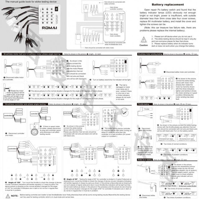 Tester controller universal bicicleta electrica (pentru motoare brushless - fara perii - cu senzori Hall) Compatibil cu : 24, 36, 48, 60, 72 Volti Ce puteti testa cu acest produs: iesirea 3 faze al controllerului i esirea controllerului catre senzorul HALL senzorii HALL la iesirea din motor iesirea din motor 3 faze acceleratie Specificatii: Temperatura de lucru: -20 C-50 C Dimensiune: 10,5x7,5x2,5cm Putere: baterie de 9V (inclusa) Pachet inclus: 1x Tester motor fara perii 1x Manual in engleza 1x baterie 9v