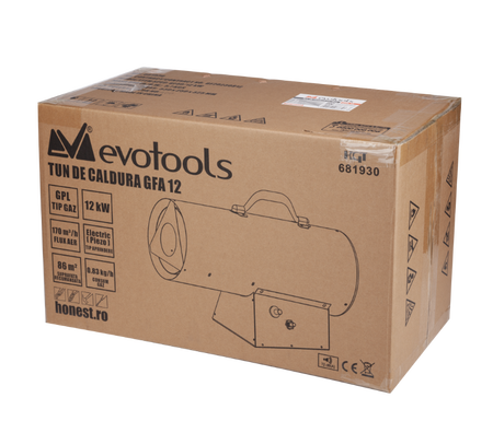 Cu aprindere electrică și protecție la supraincalzire, tunul de căldură pe gaz EvoTools GFA 12 este optimizat pentru o utilizare sigură și performantă în condiții controlate.
