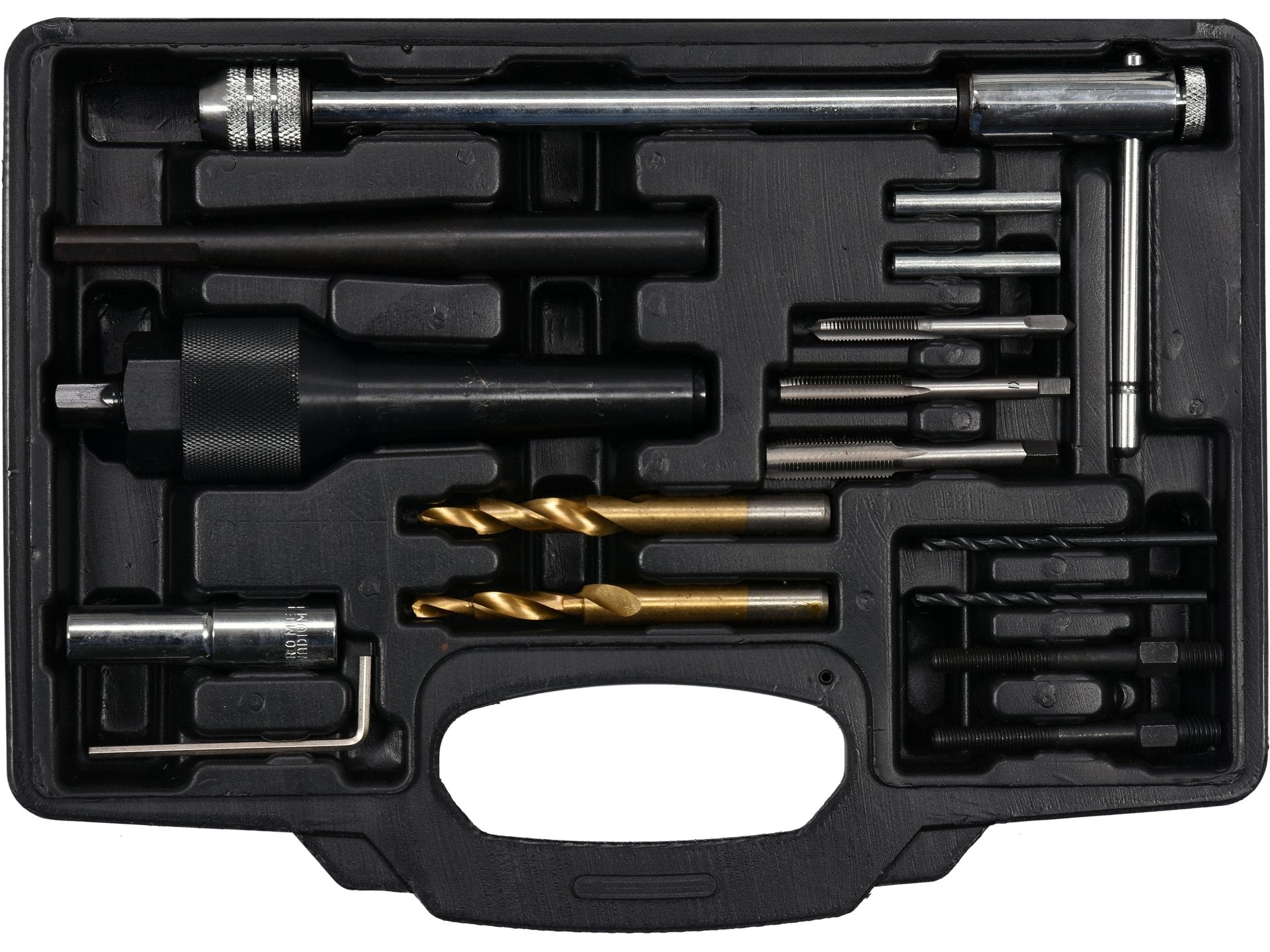 - Setați conținutul: ax - unealta de centrare|burghiu x2 (3,5 mm)|aleză x2 (7x5,5, 9x5,5)|știft x2 (6x3,5 mm)|atingeți butonul|robinet x3 (1/4 NF28, M8x1, M10x1)|extractor x2|